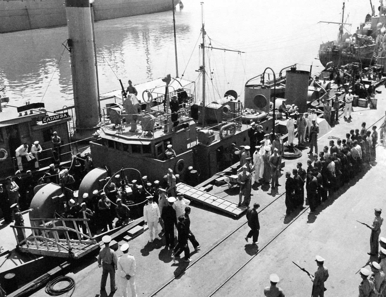 Howard Greene 331k 33 survivors of sunken U-boat U-352 are disembarked from her slayer, USCGC Icarus (WPC-110), at Charleston, the day after the sinking, 10 May 1942. Catawba (YT-32) is moored alongside Icarus. Notice the Marine guards with fixed bayonets.