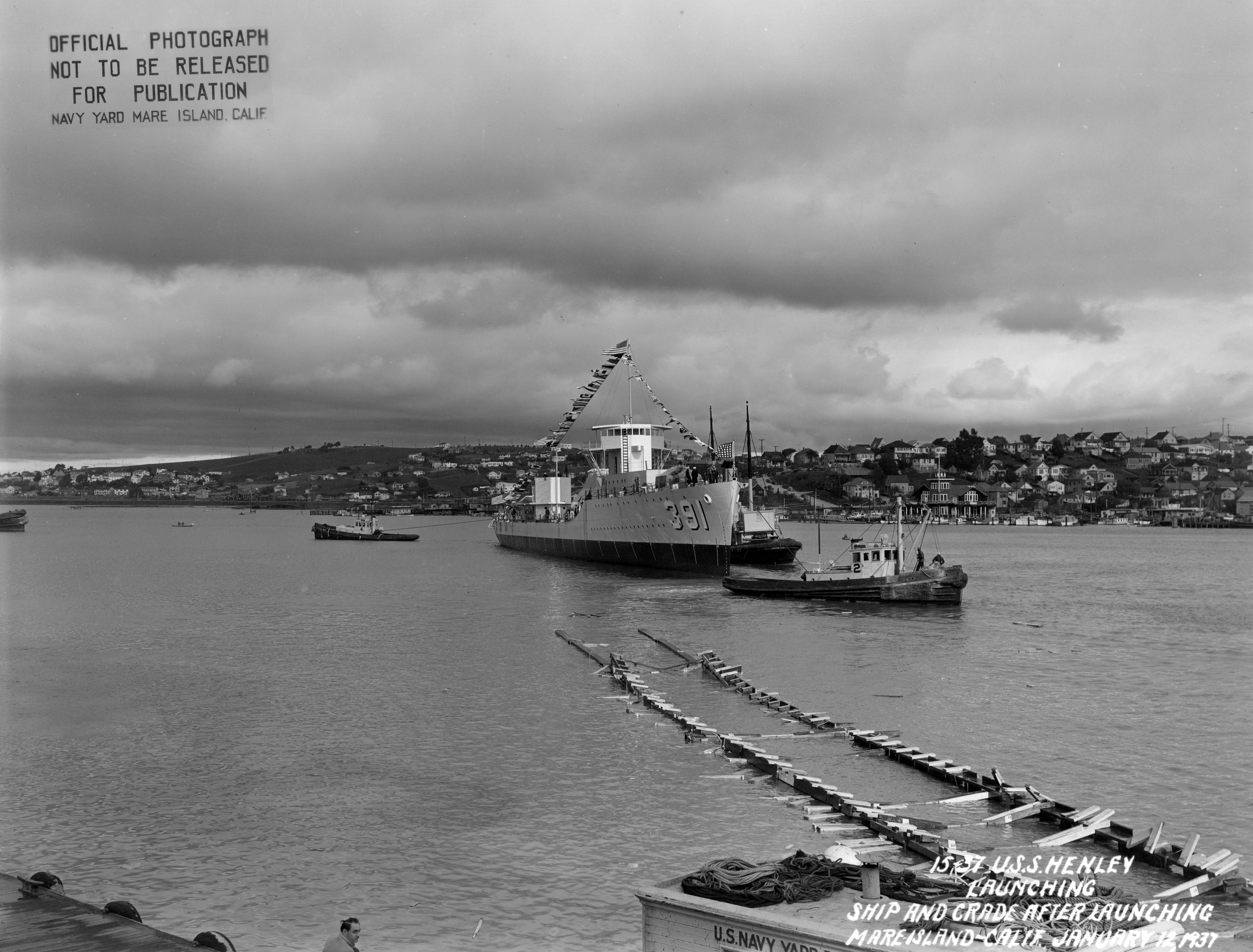 1906k | Mare Island Navy Yard tugs assist USS Henley (DD-391) in the Mare Island channel after her launching on 12 January 1937. YMT-10 on the starboard side, bows on facing the camera. YMT-4 has a line at the stern. Navigator (YT-39) is visible on the port side of Henley and YMT-2 is departing the area forward of Henley. File name: DD 391 16-37, Navy Photo, 1/12/1937 |