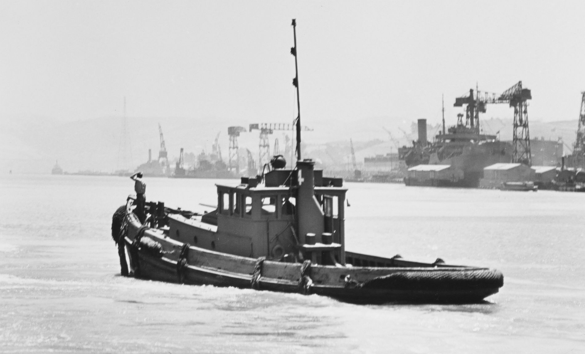 147k | YMT-4 maneuvering astern of Taganak (AG-45) off Mare Island Navy Yard, 26 July 1942. National Archives photo 19-N-32050, from the Bureau of Ships collection (cropped) |