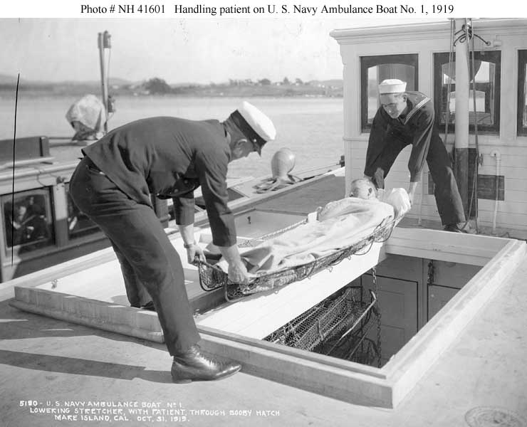 66k | Crew members of Yard Ambulance Boat No.1 lowering a stretcher containing a patient through the starboard side of the booby hatch aft of the pilot house at Mare Island Navy Yard, 31 October 1919. Note the stretchers already suspended under the port side of the hatch. US Navy photo # NH 41601 from the collections of the Naval Historical Center, collection of Rear Admiral Ammen C. Farenholt, USN (Medical Corps) |