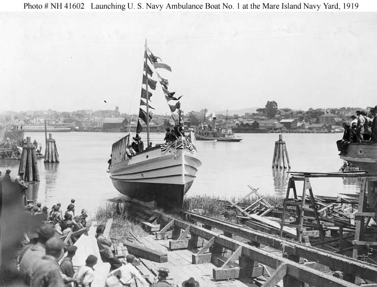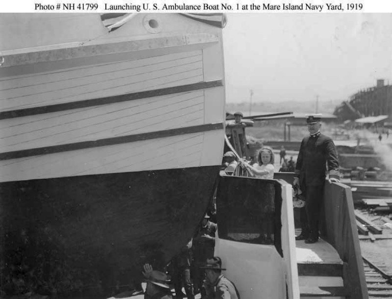 68k | Yard Ambulance Boat No.1 just before her launching at the Mare Island Navy Yard, CA, 24 July 1919. Preparing to christen the vessel is the daughter of CDR John L. Neilson, USN (Medical Corps). CDR Neilson is also on the platform. US Navy photo # NH 41799 from the collections of the Naval Historical Center, collection of Rear Admiral Ammen C. Farenholt, USN (Medical Corps) |