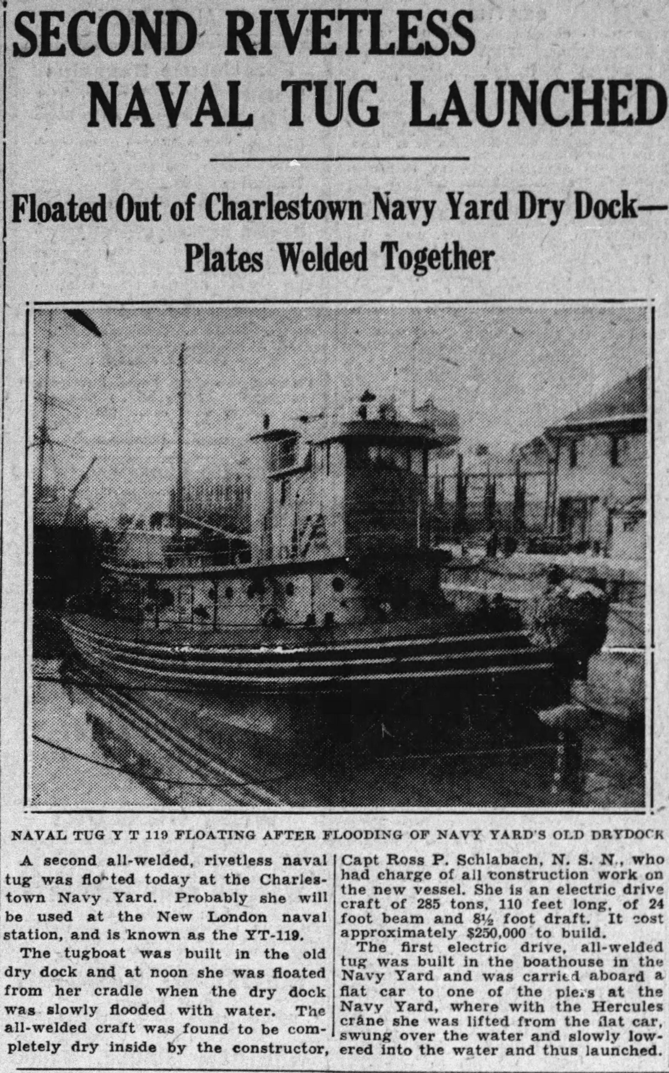 1160k | Article about launch of YT-119 at Boston Navy Yard, from The Boston Globe, 20 December 1932. Please note the photo as published has been reversed. | Dave Wright | |