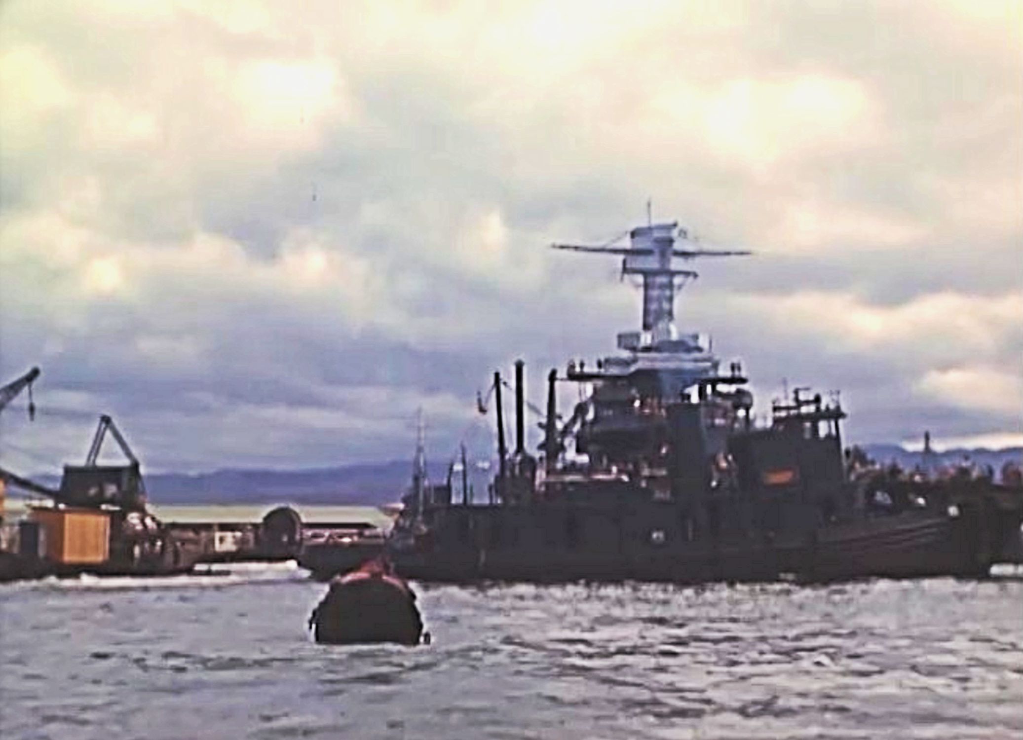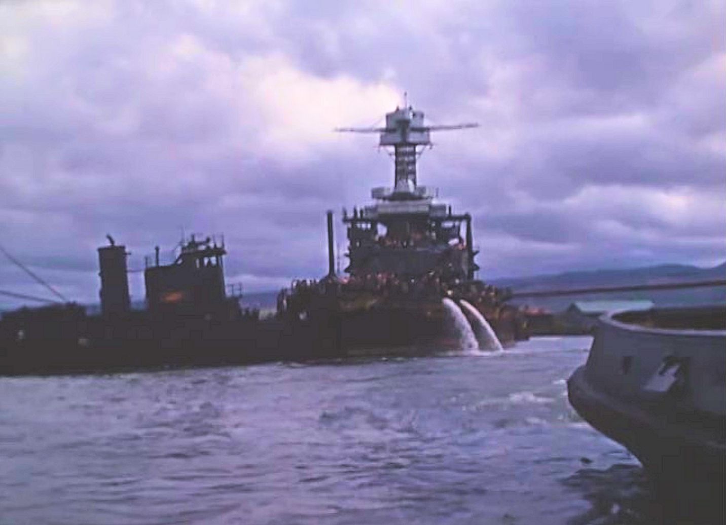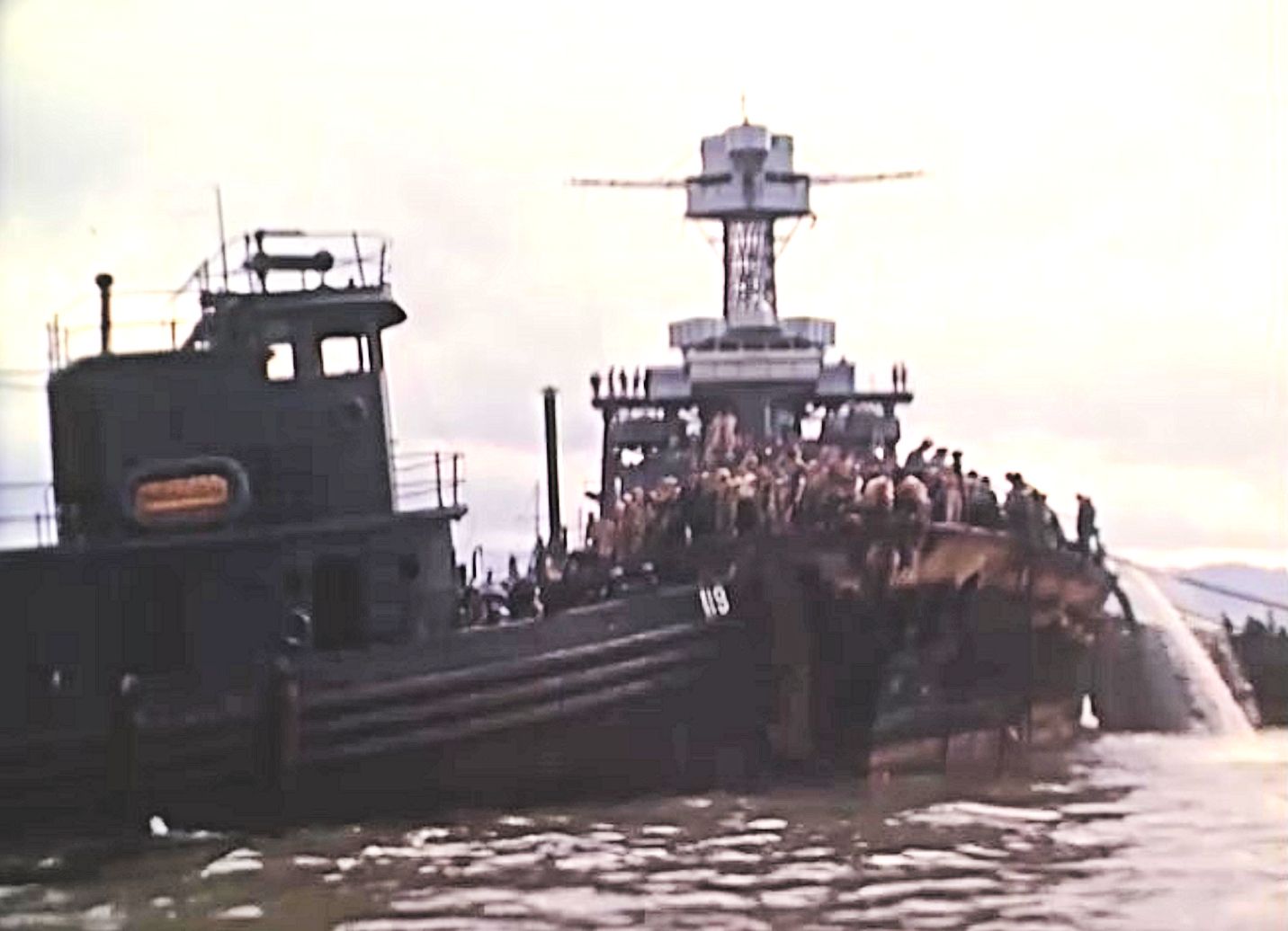 213k | Geronimo (YT-119) moving California (BB-44) to drydock at Pearl Harbor Navy Yard, 09 April 1942. Still frames from short film "Pearl Harbor: Spring 1942" filmed by Hollywood movie director Commander John Ford (USNR)'s film crew. National Archives ID 2663369, Local ID 428-NPC-47631 |