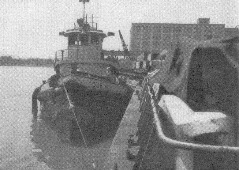 Heekon (YTM-141) easing a lighter up to a wharf at the Naval Gun Factory, Washington, D.C., date unknown. US Navy photo from "All Hands" magazine, March 1952. |