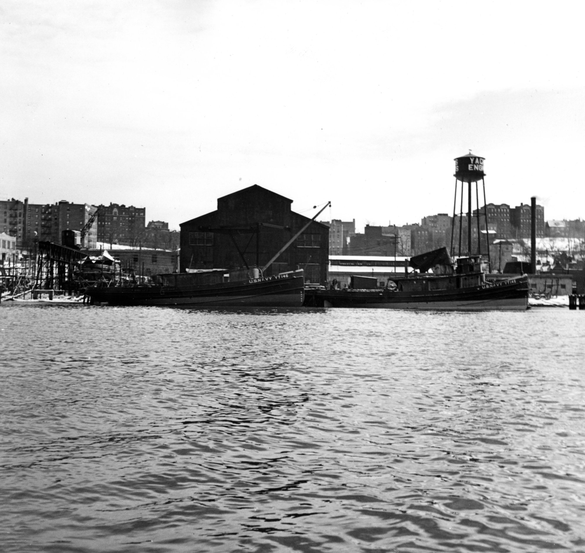 381k | Montezuma (YT-145) right and Hoga (YT-146) left moored at Consolidated Shipbuilding Corp., Morris Heights, NY, soon after they were launched in December 1940. National Archives photo. | - | |