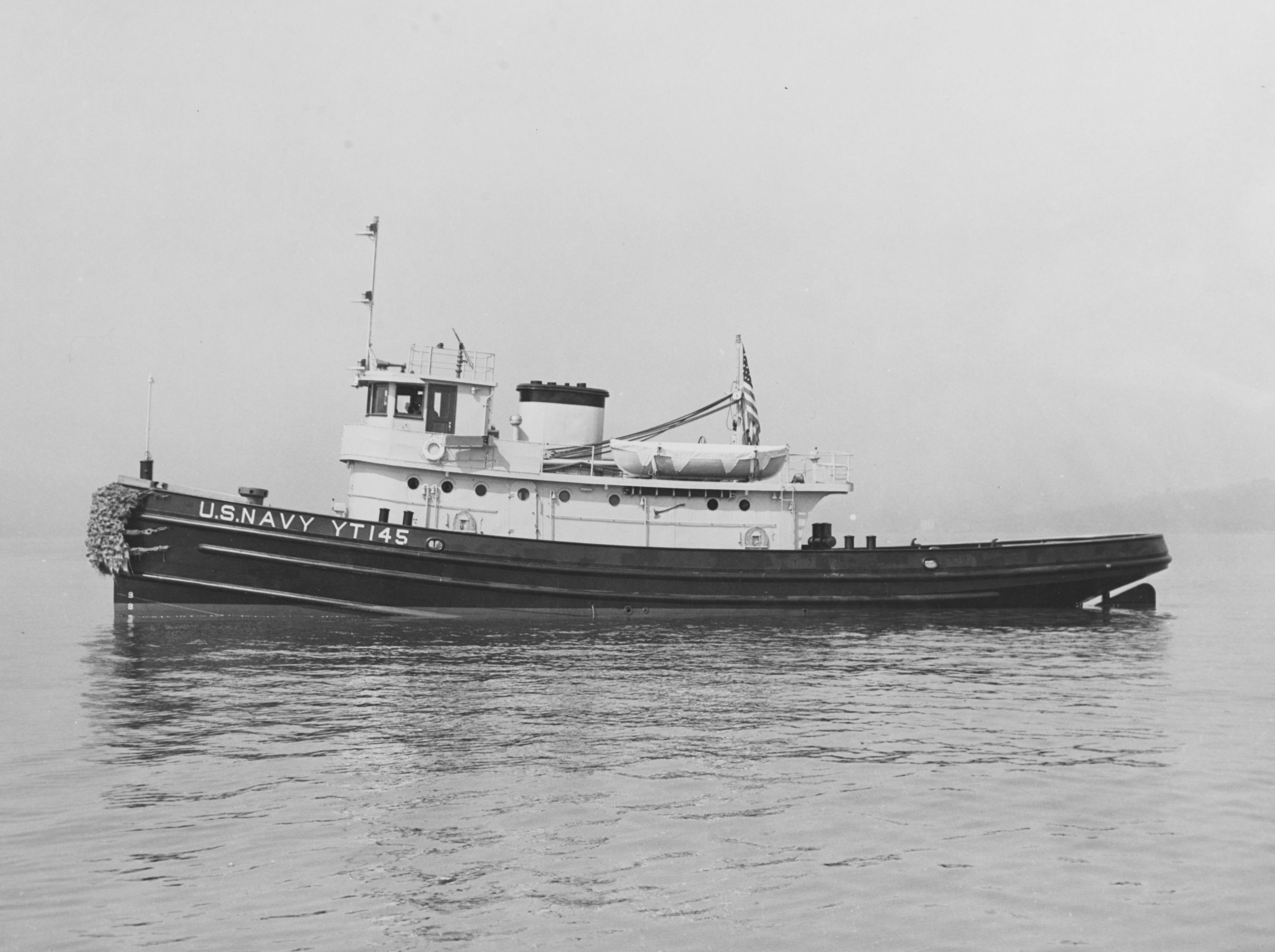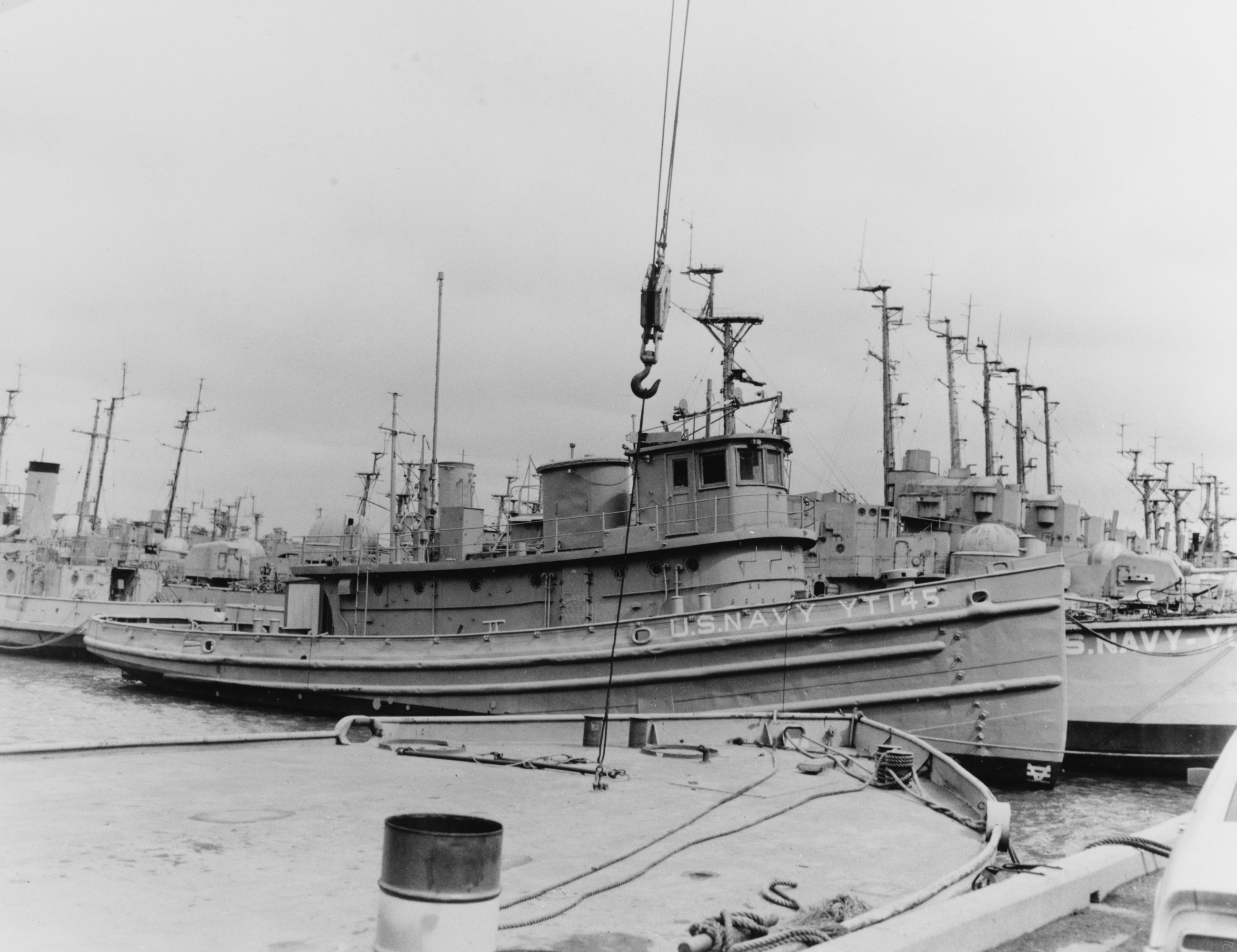 98k | Cropped view of above photo, showing Montezuma (YT-145). | Robert Hurst, courtesy Saunders Towboat Co., and Paul Smith US Navy Harbor Tug Boats web site |