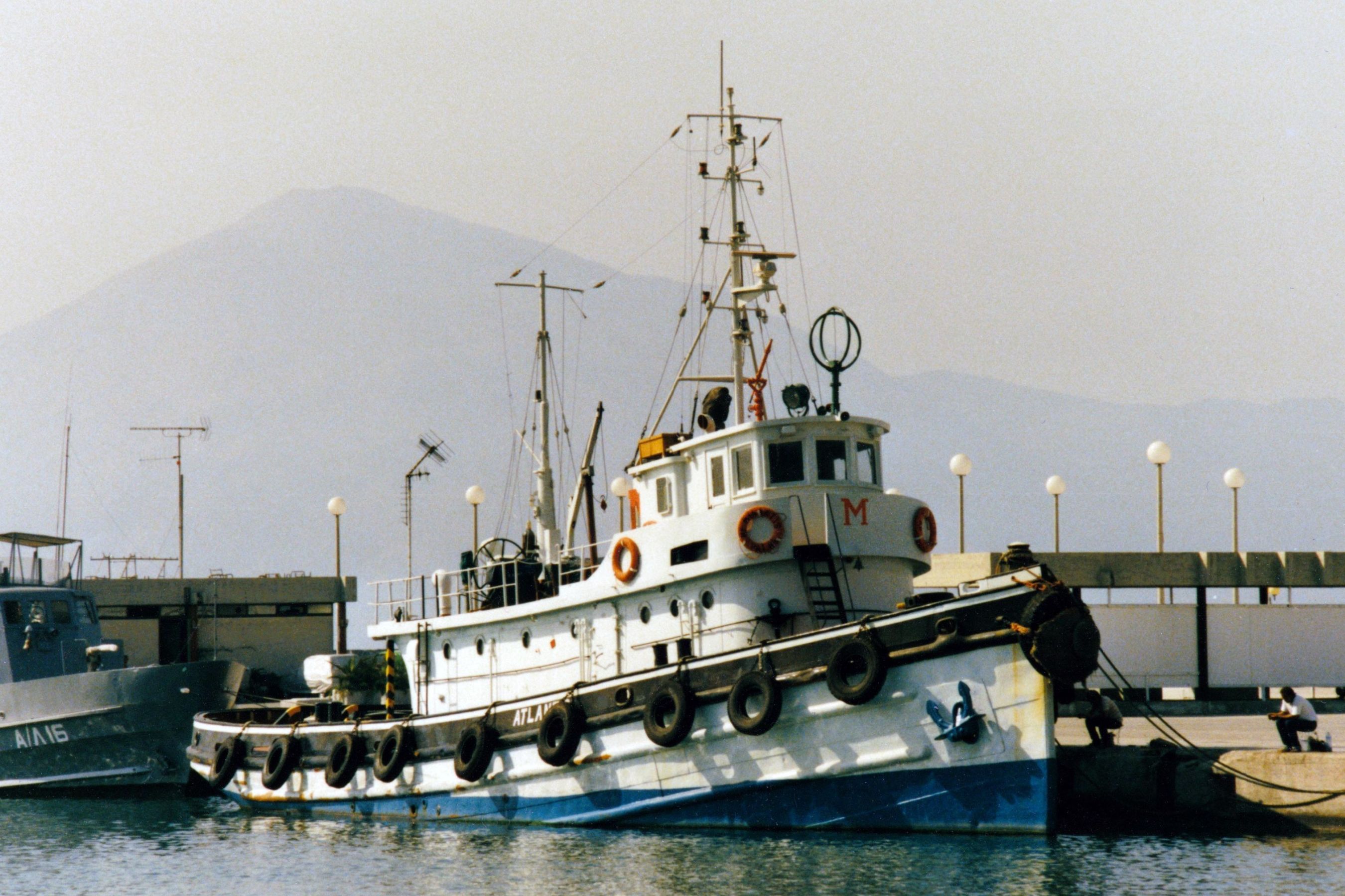 610k | In merchant service as Atlantis, moored at Patras, Greece, 04 July 1988. Photo copyright "Frafo" via shipspotting.com. |