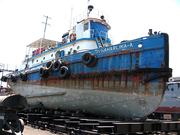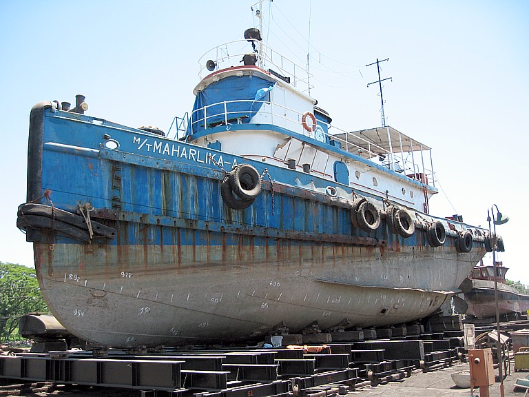 Starboard bow view of ex- Madokawando (YTM-180) in foreign merchant service as MT Maharlika - A dry docked at Iron Construction & Marine Works Inc. (PICMW) in Jasaan, Misamis Oriental, Philippines, 8 July 2008. |