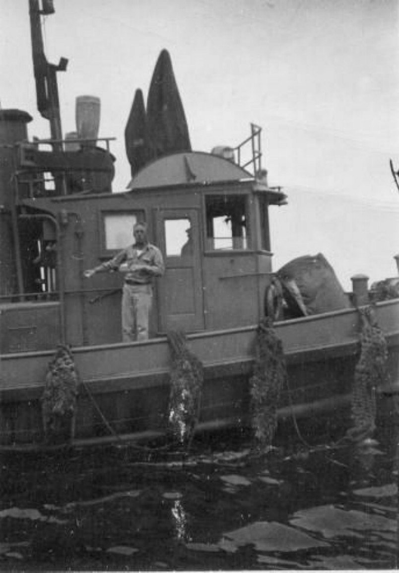 113k | CHBOSN Fred Reep standing outside the pilothouse of YTL-197 in the harbor at Bizerte, Tunisia in 1944. Photo National Association of Fleet Tug Sailors, courtesy Fred Reep Jr. |