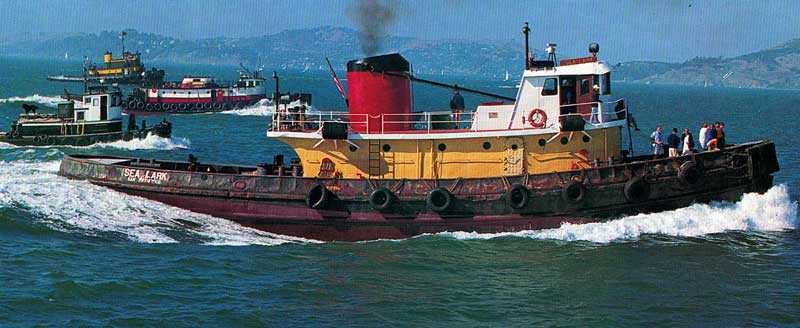 84k | Sea Lark underway during a tug race in San Francisco Bay, which she won, date unknown. Behind Sea Lark is the commercial tug Orion (ex-Quileute (YTM-540). This is the winning photo that was on a calendar. Photo courtesy Glen Simmons. Photo and text courtesy National Association of Fleet Tug Sailors (NAFTS). |