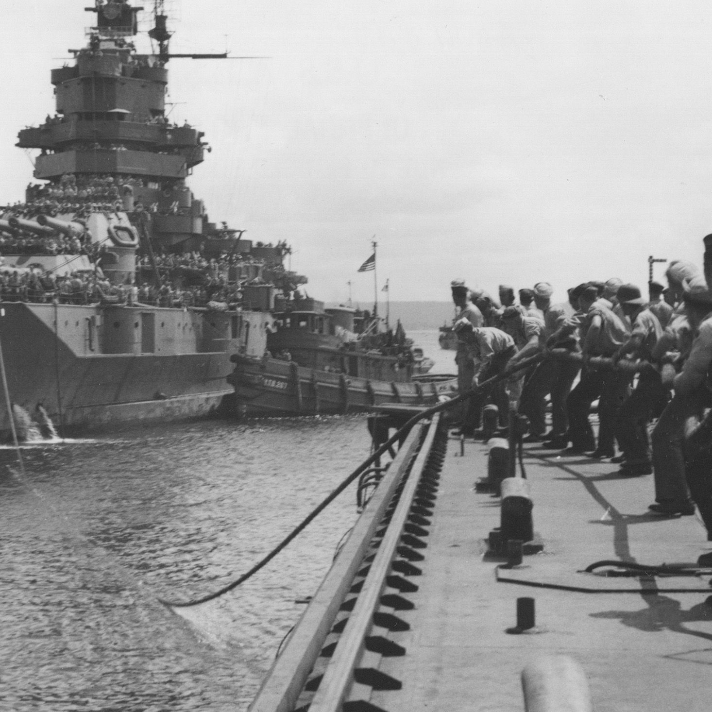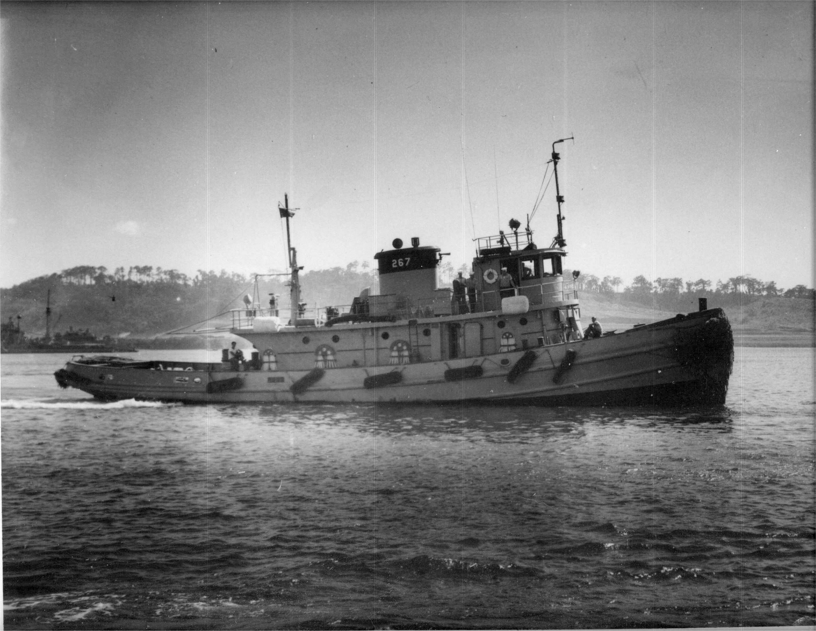 269k | Pogatacut (YTB-267) and other small craft assist Idaho (BB-42) into floating drydock ABSD-1 at Espiritu Santo, 15 August 1944. National Archives photo 80-G-314132 (cropped) |