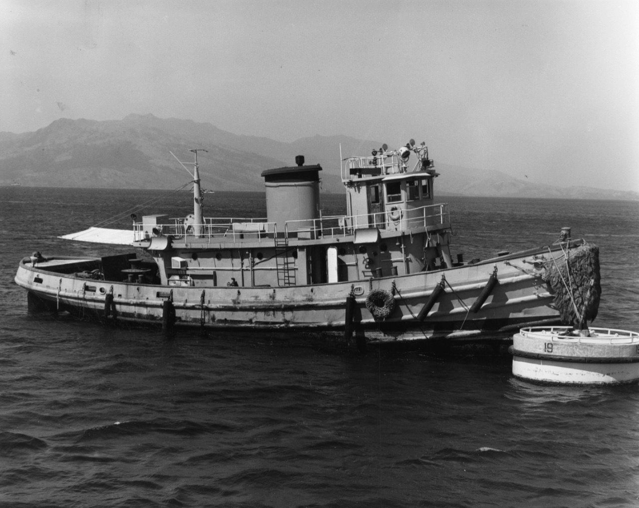 171k | Pogatacut (YTB-267) tied to a mooring buoy, probably at Subic Bay in the 1960s. Naval Subjects Collection catalog L45-231.02.01 |