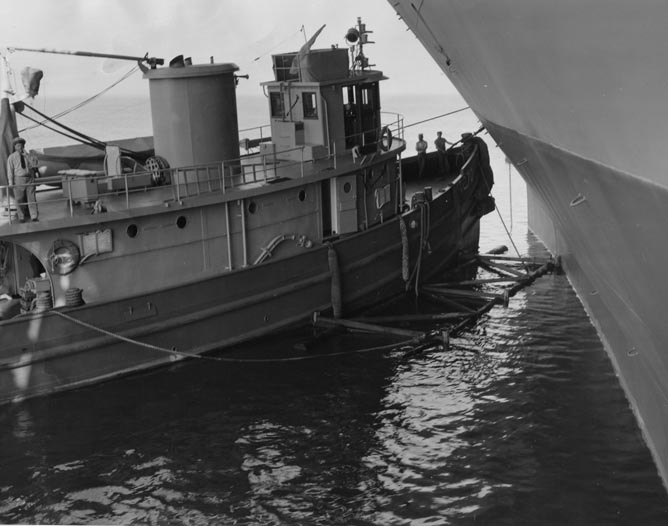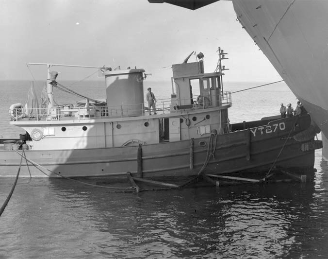 59k | Satanta (YT-270) alongside and unidentified CVE at Naval Station Astoria, OR., September 1943. | Tracy White | ||