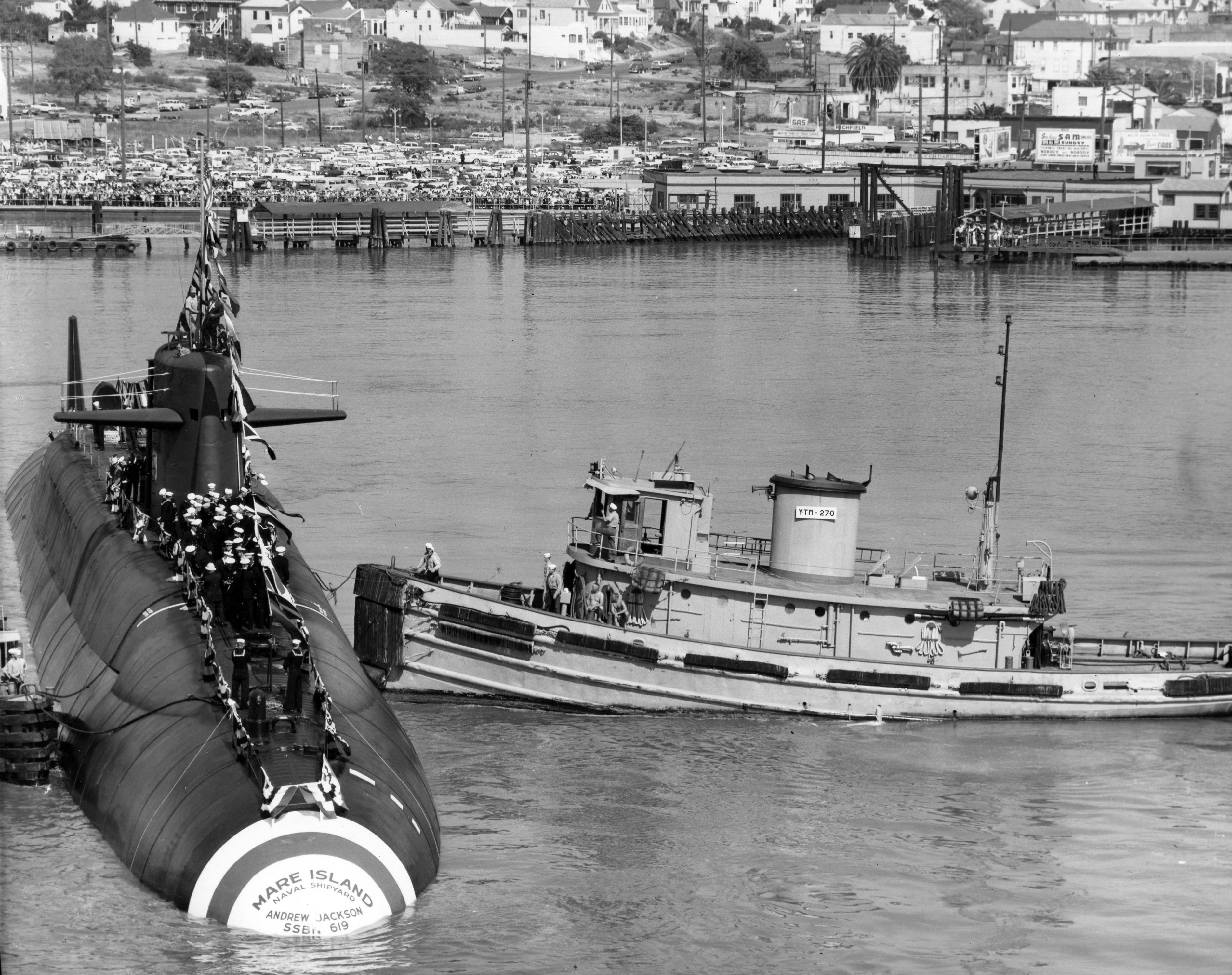 2368k | Satanta (YTM-270) is preparing to move the new launched USS Andrew Jackson (SSBN-619) to dry dock #3 after her launching at Mare Island, 15 September 1962. US Navy photo from the Vallejo Naval and Historical Museum. |