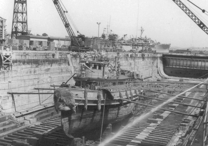 98k | Ossahinta (YTB-278) in dry dock #2 at Navy Yard Mare Island, 01 August 1947. Ossahinta was in dry dock from 01 to 12 August 1947 for normal maintenance. Navy Yard Mare Island photo # 1467-47 (cropped). |
