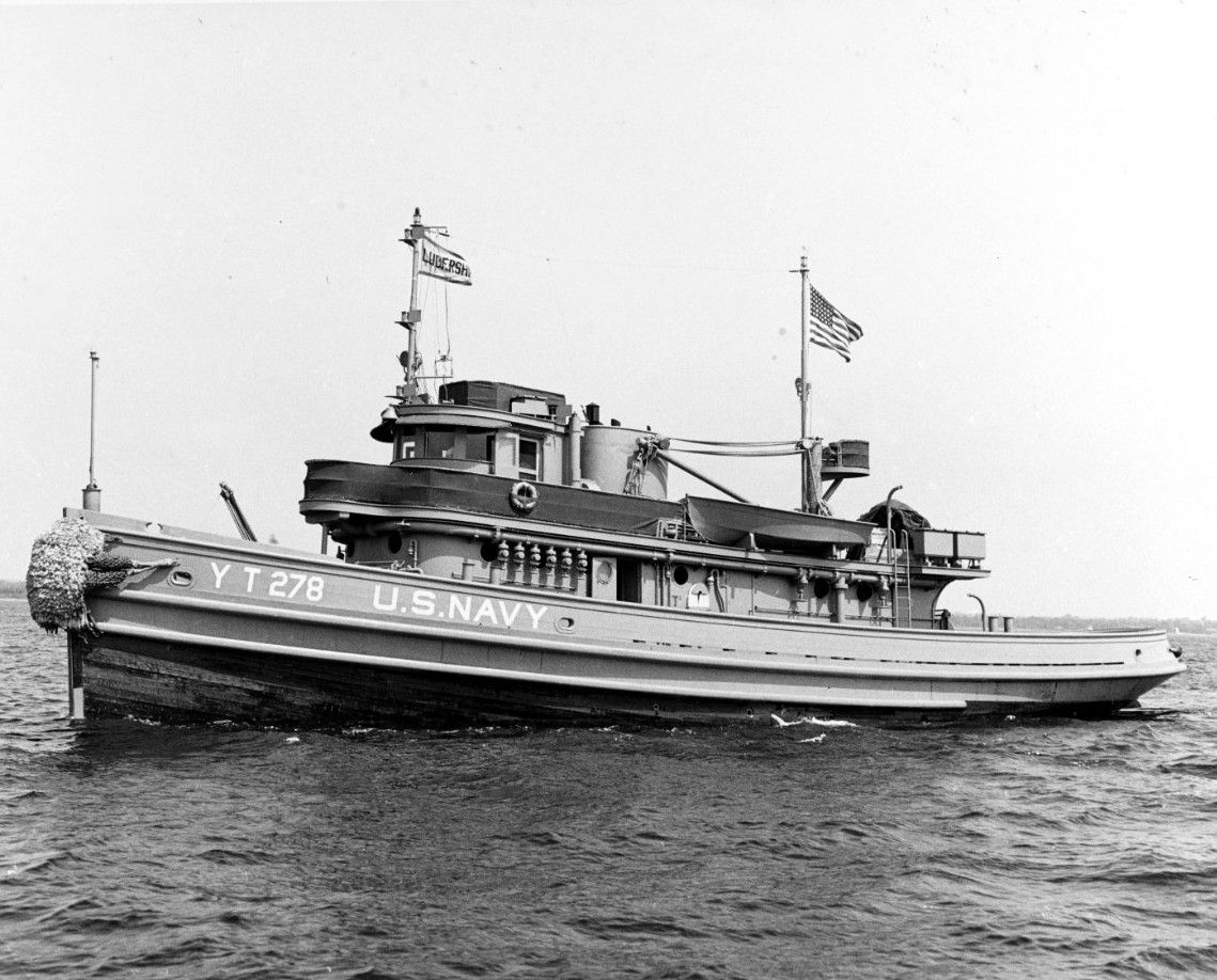 171k | Ossahinta (YTB-278) on trials, July 1944. Note the builders' flag flying from her mast. Photo received by Bureau of Ships from the Superintendent of Shipbuilding, New York, September 1944. National Archives photos 19-N-70940 |