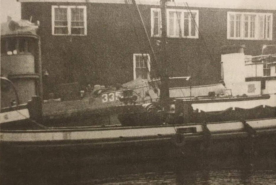 Dohasan (YTM-335) after her return to Foss and awaiting refit at Tacoma, 1947. This is the only known photo of her in her wartime rig and colors. Photo courtesy Northwest Seaport via Wikipedia. |