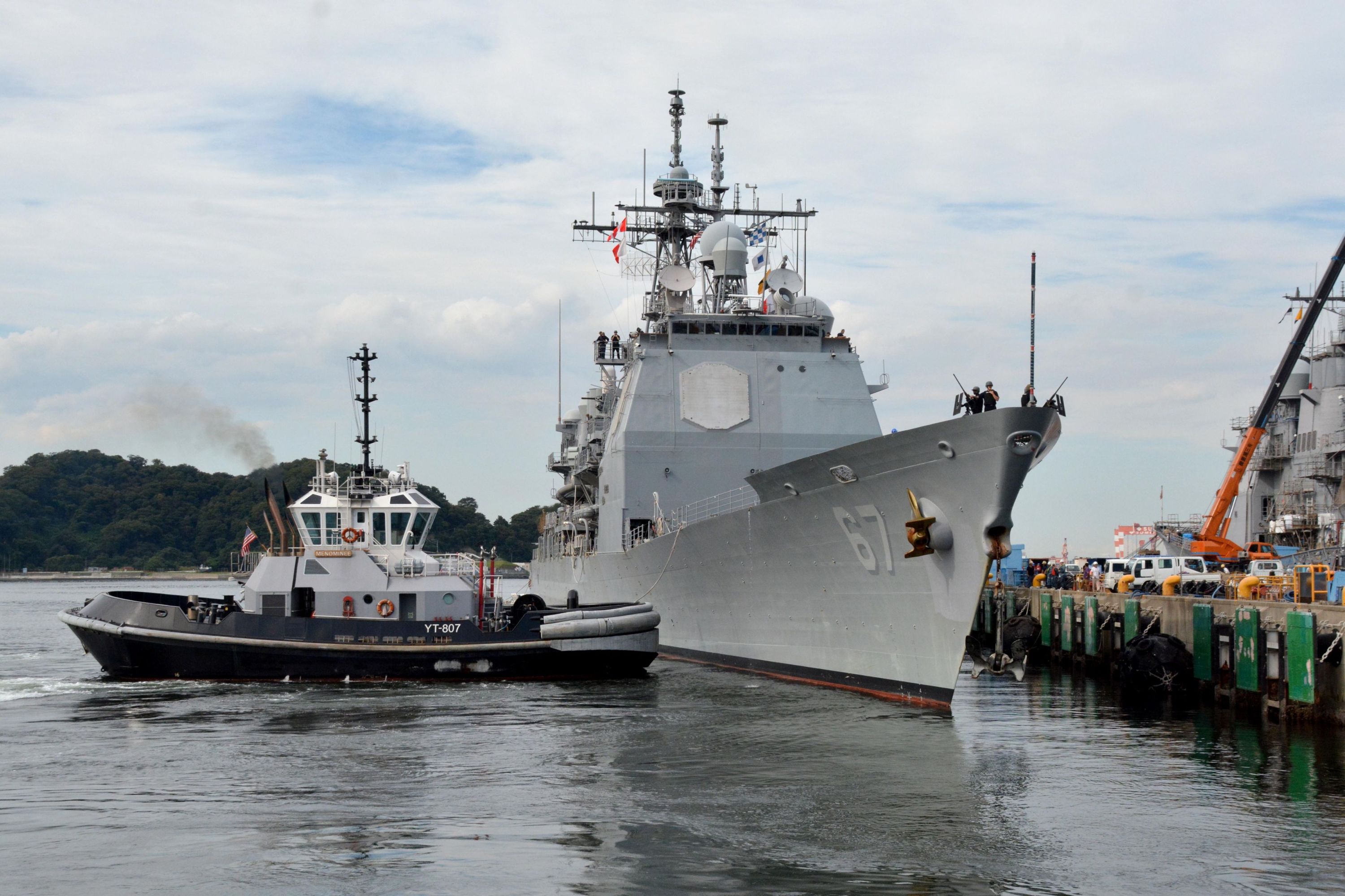 645k | The Valiant-class yard tugboat Menominee (YT 807) assists the Ticonderoga-class guided missile cruiser Shiloh (CG 67) as it departs Fleet Activities (FLEACT) Yokosuka to continue its patrol, 06 October 2016.