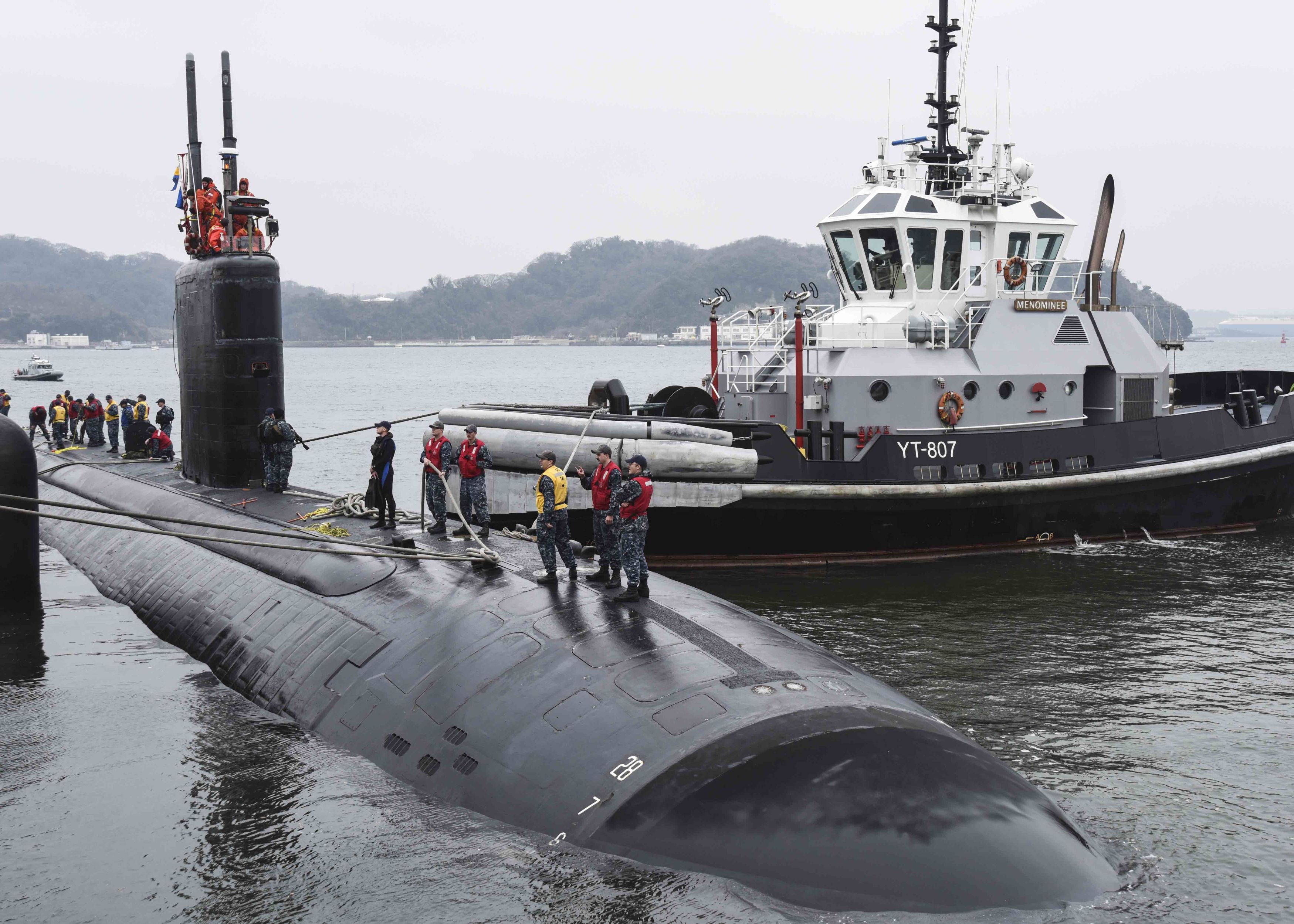 980k | Menominee (YT 807) mooring the Los Angeles-class attack submarine USS Santa Fe (SSN 763) as it arrives at Fleet Activities (FLEACT) Yokosuka for a port visit, 02 March 2017.