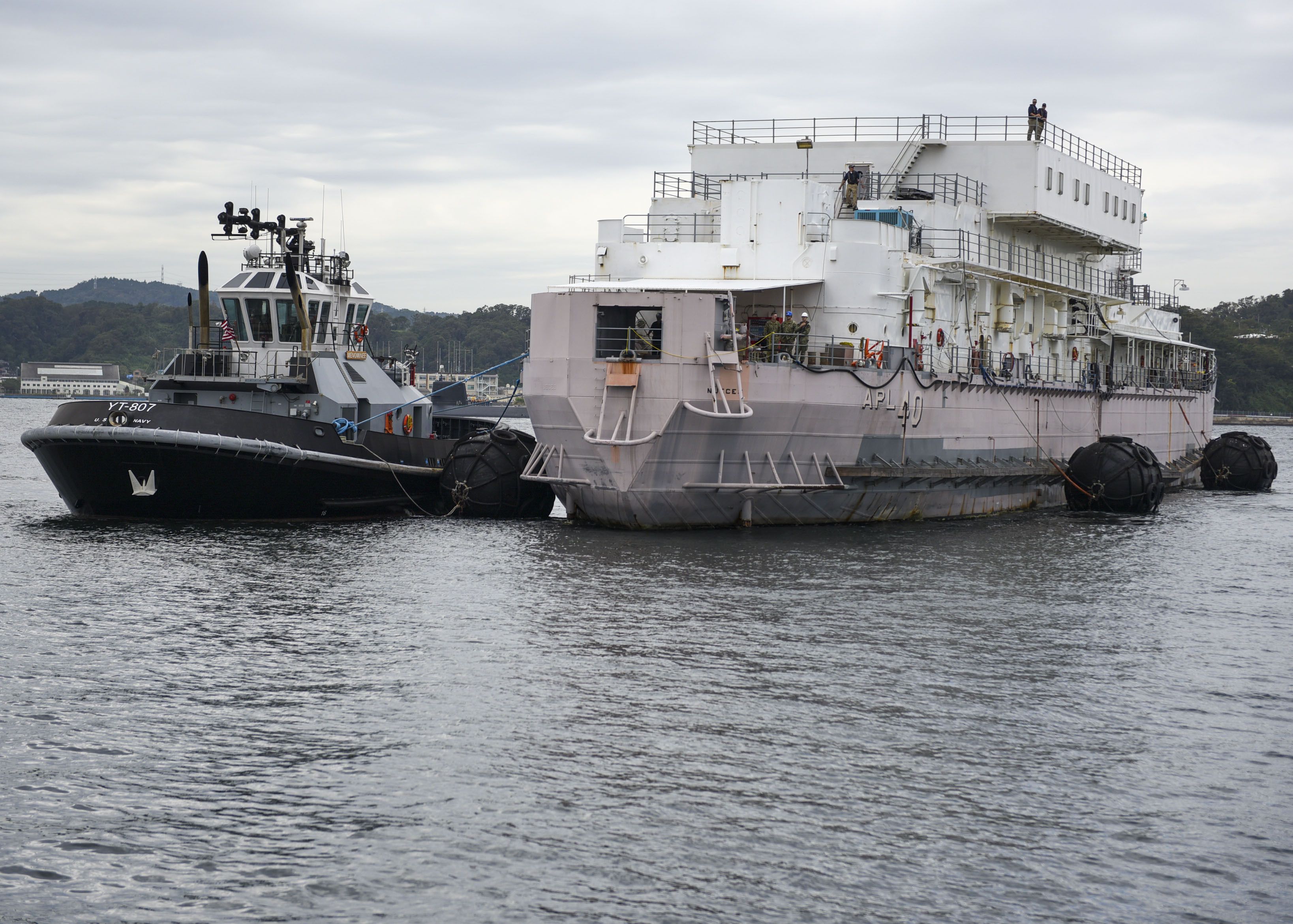 935k | Menominee (YT 807) assists the non-self-propelled barracks bhip USS Nueces (APL 40) into a dry-dock in preparation for Super Typhoon Hagibis at Yokosuka, 10 October 2019. US Navy photo 191010-N-HH215-1059 by Mass Communication Specialist 2nd Class Tyler R. Fraser |