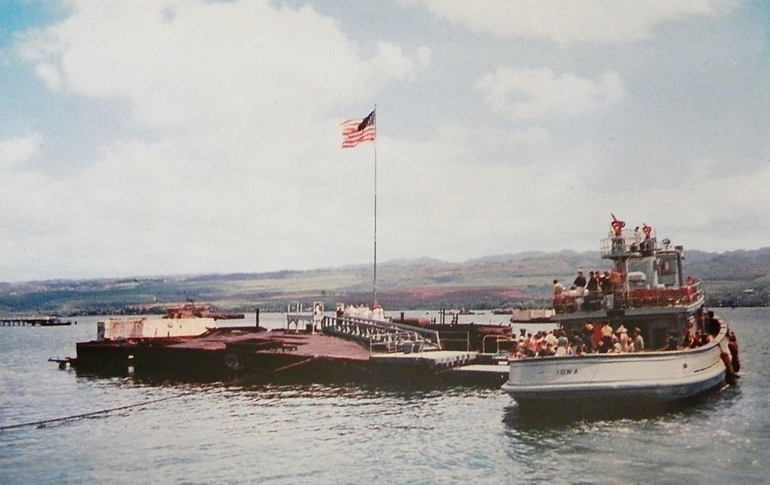 Photo postcard of Iona (YTB-220) bringing a load of visitors to the wreck of USS Arizona in the early 1950s. The present memorial was not opened until 1962. |