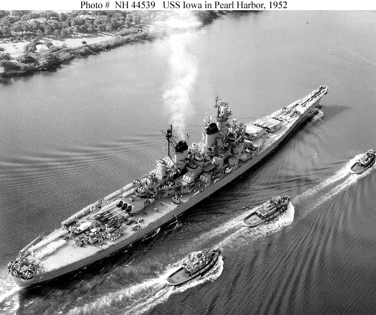 139k | USS Iowa (BB-61) underway in Pearl Harbor with an escort of harbor tugs, while en route to the U.S. at the end of her Korean War combat tour. The middle tug is Anacot (YTB-253). US Navy photo # NH 44539 from the collections of the US Navy History and Heritage Command. |