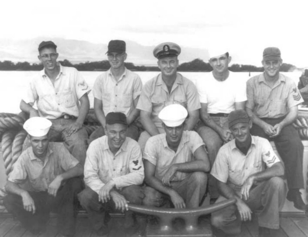 104k | Oneyana (YTB-262) circa 1960-61 crew photo. Back Row L-R Jerry Kern, ?, BMC Beasley, CM2 Brietkoph, EN1 Darrel Ready. Front Row L-R ?, ?, SN Patrick Hayes, EM2 Norman Holmes. Photo and text from National Association of Fleet Sailors web site. | Robert Hurst, courtesy Jerry Kern and the National Association of Fleet Tug Sailors (NAFTS) | |