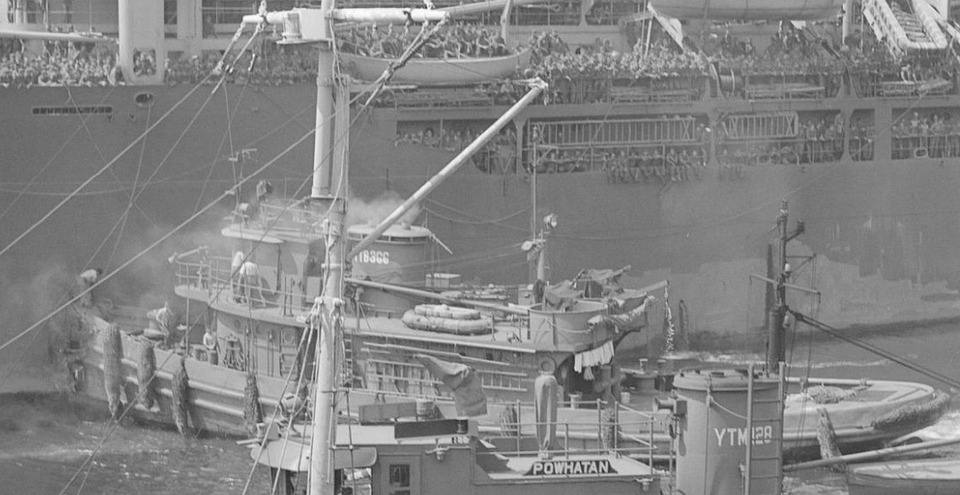 148k | Waubansee (YTB-366) assisting General J.R. Brooke (AP-132) at Boston Navy Yard, probably during 1945. Powhatan (YTM-128) is moored in the foreground.