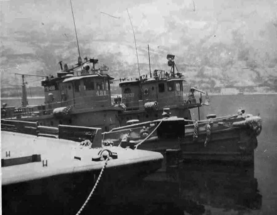 62k | Cholocco (YTB-498) moored inboard of Nanigo (YTB-537) at Naval Air Station Kodiak, Alaska, date unknown. Photo courtesy of Paul Smith US Navy Harbor Tug Boats |
