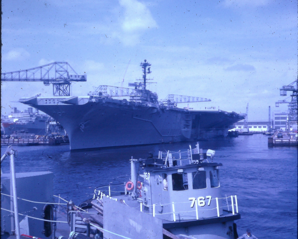 201k | Ankachak (YTM-767), is partially visible in the foreground, with USS Forrestal (CVA-59), at Norfolk Naval Shipyard, Portsmouth, VA. early 1968 (probably February–April). Forrestal was completing extensive repairs after the tragic July 1967 fire. Photo taken from USS John W. Weeks (DD-701),