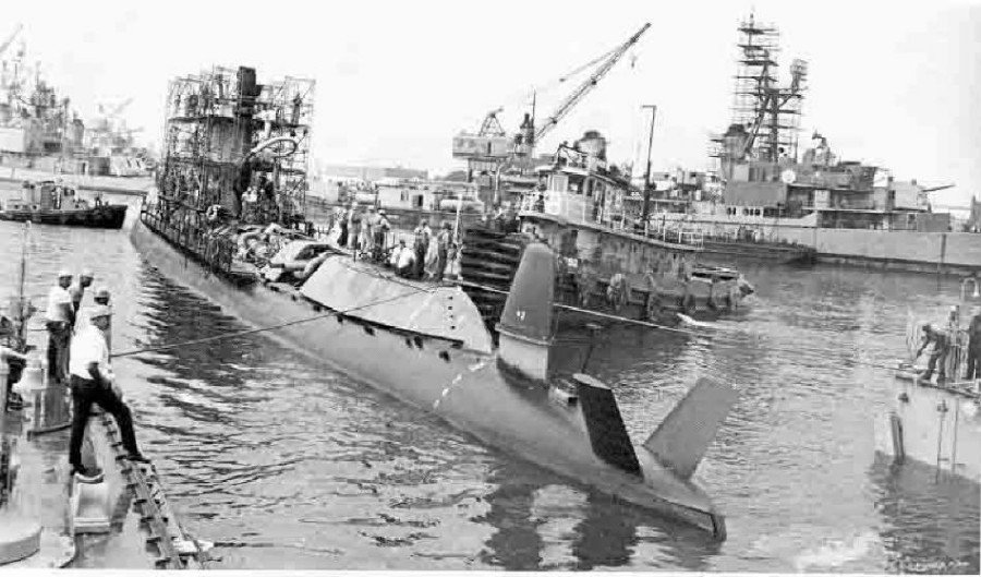 112k | Hastwiana (YTB-512) maneuvering an unidentified submarine at a naval shipyard, date and location unknown. Photo courtesy of Paul Smith US Navy Harbor Tug Boats |