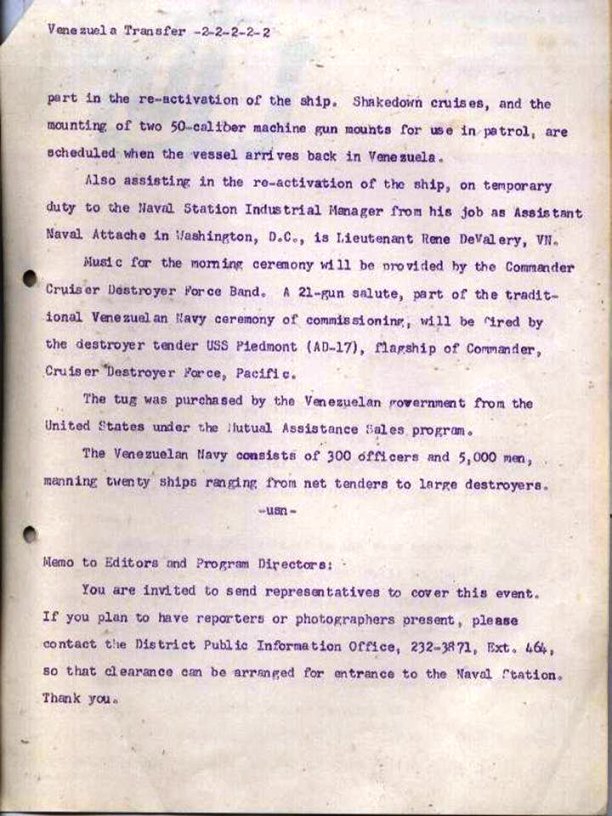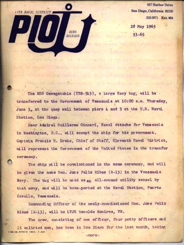 Eleventh Naval District News Release, dated 28 May 1965, announcing the transfer of the large harbor tug Oswegatchie (YTB-515) to the Government of Venezuela, 3 June 1965, at Naval Station San Diego. |