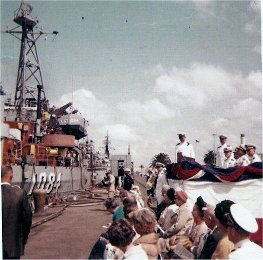 Pierside dignitaries and guests at the commissioning of ARV Jose Felix Ribas (R-13) (ex-Oswegatchie (YTB-515)) into the Navy of Venezuela, 3 June 1965, at Naval Station San Diego. Note USS Polk County (LST-1084) moored astern of ex-Oswegatchie. |