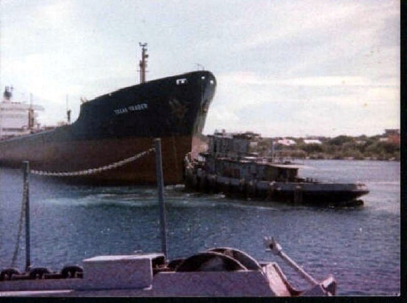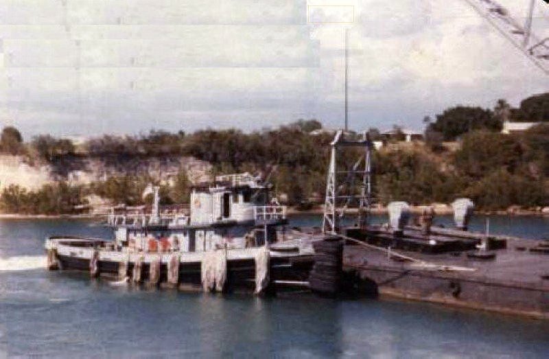 Tutahaco (YTM-524) assisting an MSC contract tanker into or out of her berth at in Guantanamo Bay Cuba, circa 1975-78. |