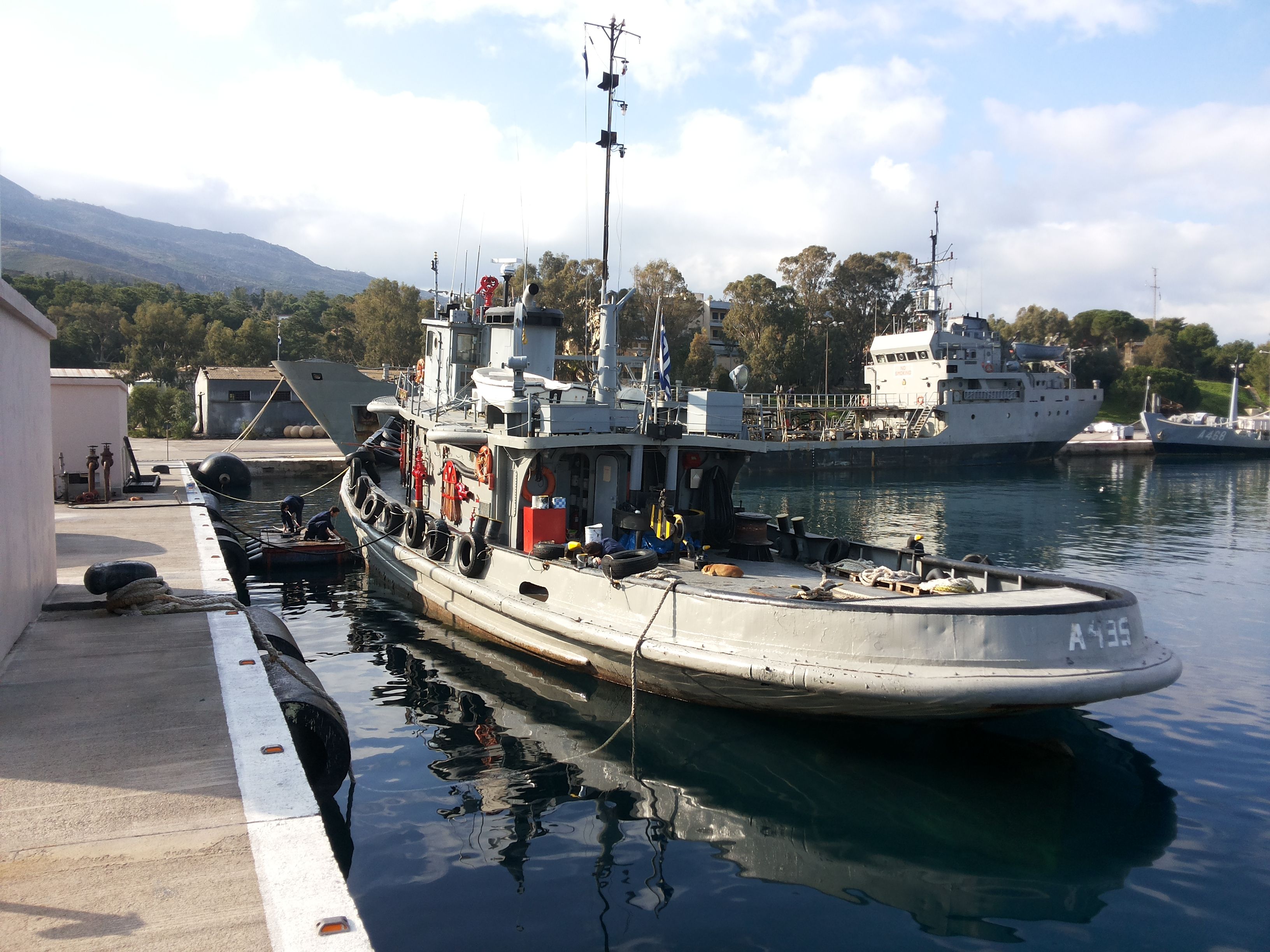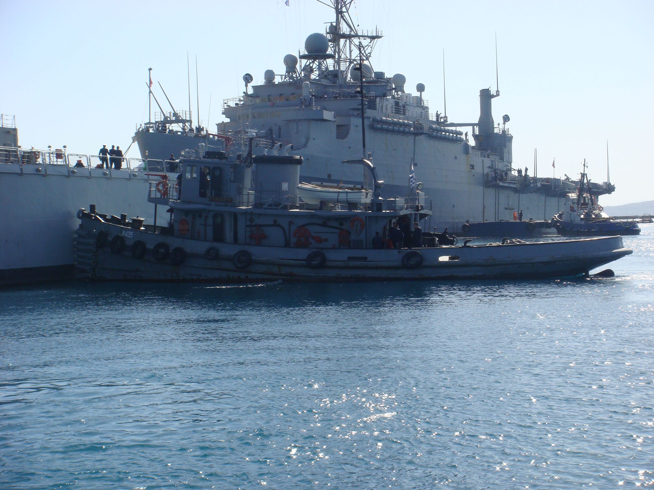 277k | HS Kekrops (A 435) (ex-Wahpeton (YTB-527)) assist the Ohio-class guided-missile submarine, Florida (SSGN-728) as it arrives for a port visit at Souda Bay, Crete, 18 June 2012.