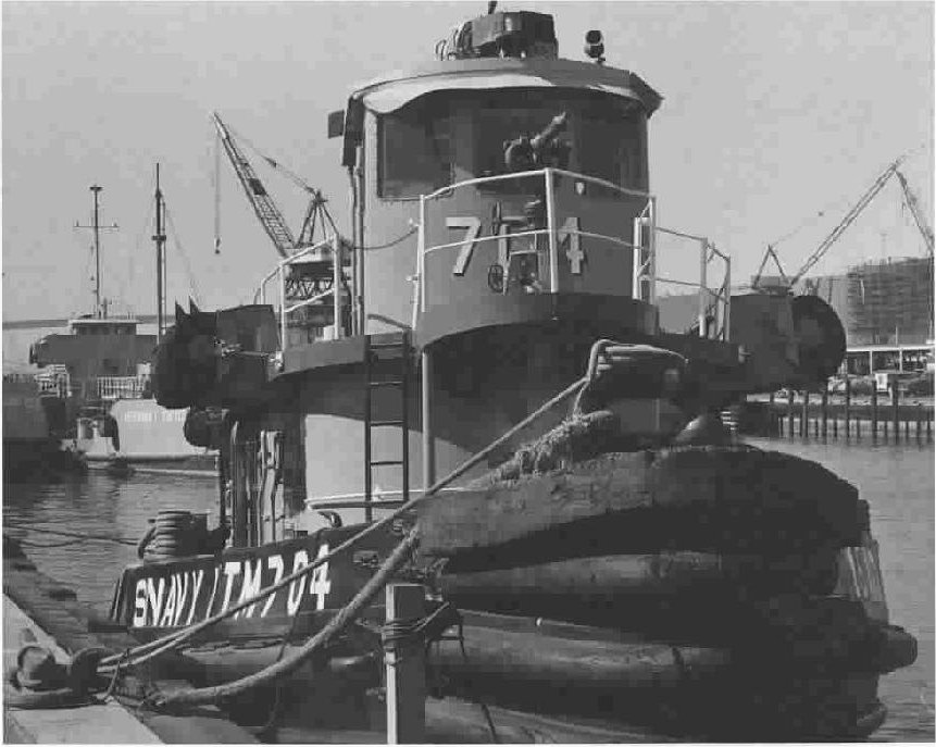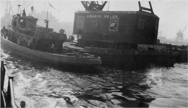 43k | Moratoc (YTB-704) underway with floating crane YD-113 alongside, date and location unknown. Photo courtesy John Betts, via National Association of Fleet Tug Sailors (NAFTS) |