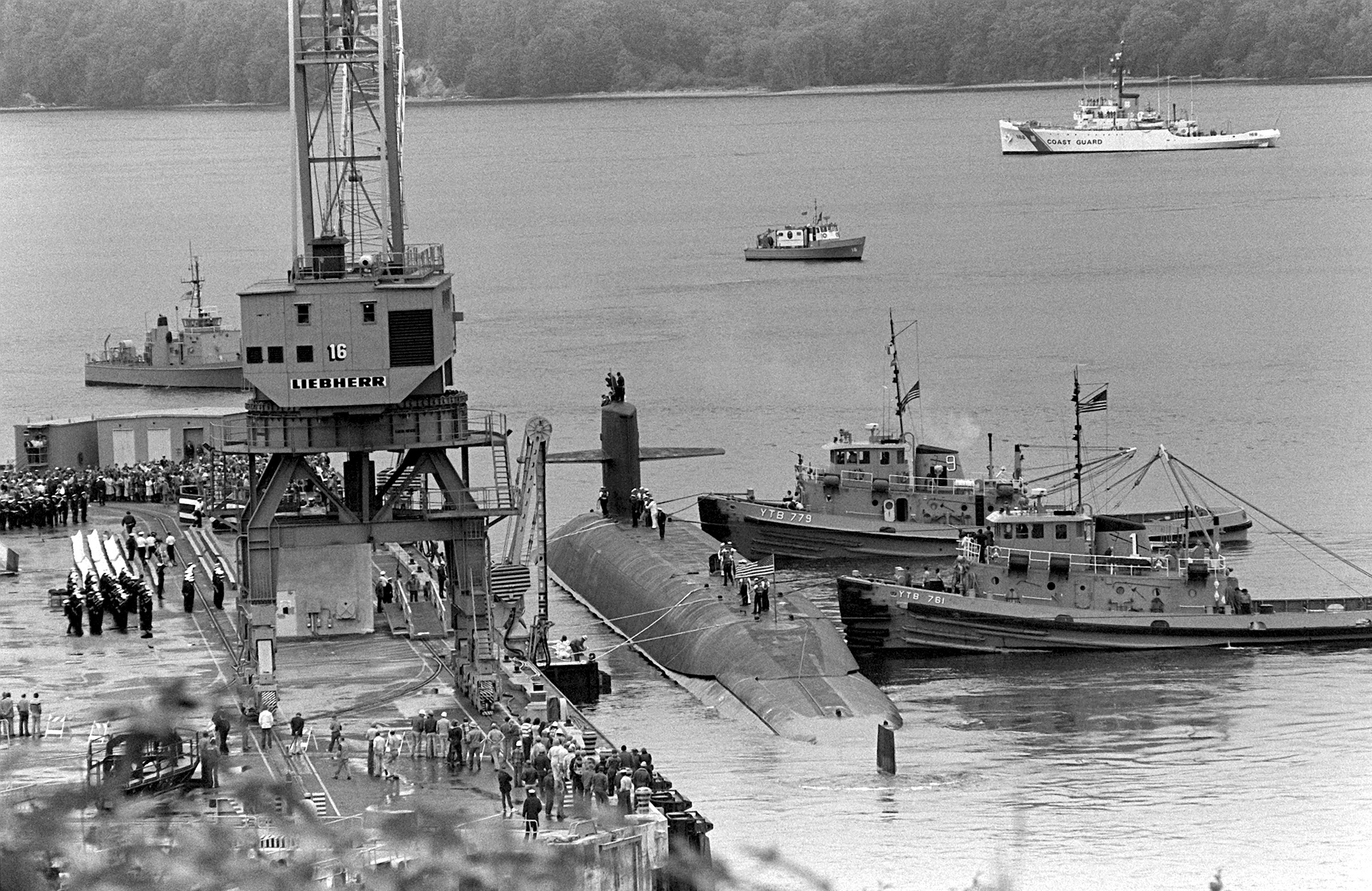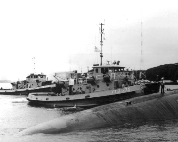 345k | Four Natick class large harbor tugs; Manhattan (YTB-779) (lower left), Arcata (YTB-768) (lower right), Ottumwa (YTB-761) (upper left) and Mishawaka (YTB-764) (upper right) assist USS Ohio (SSBN-726) out of dry dock at Delta Pier, Naval Submarine Base Bangor, WA., 15 August 1983. US Navy photo by PH1 Steve Smith. |