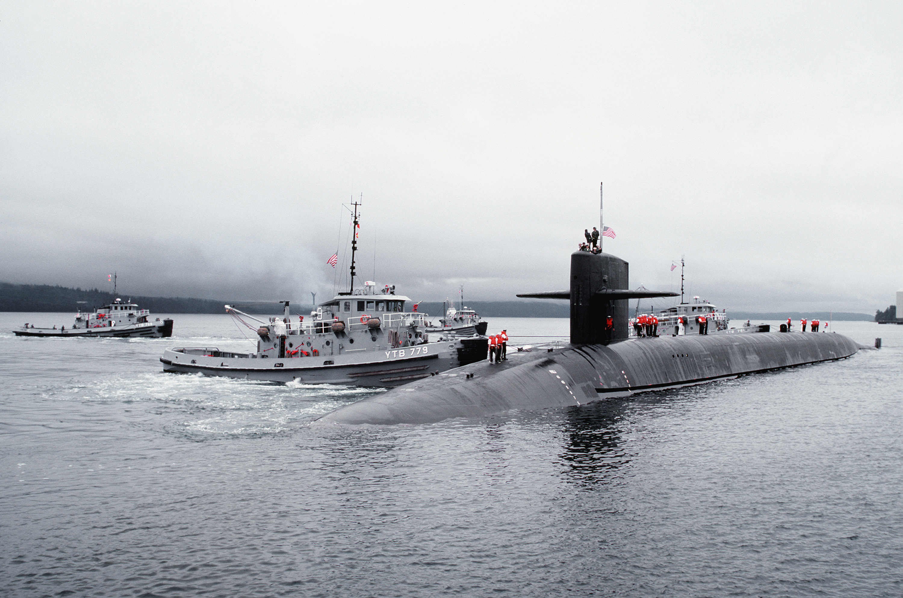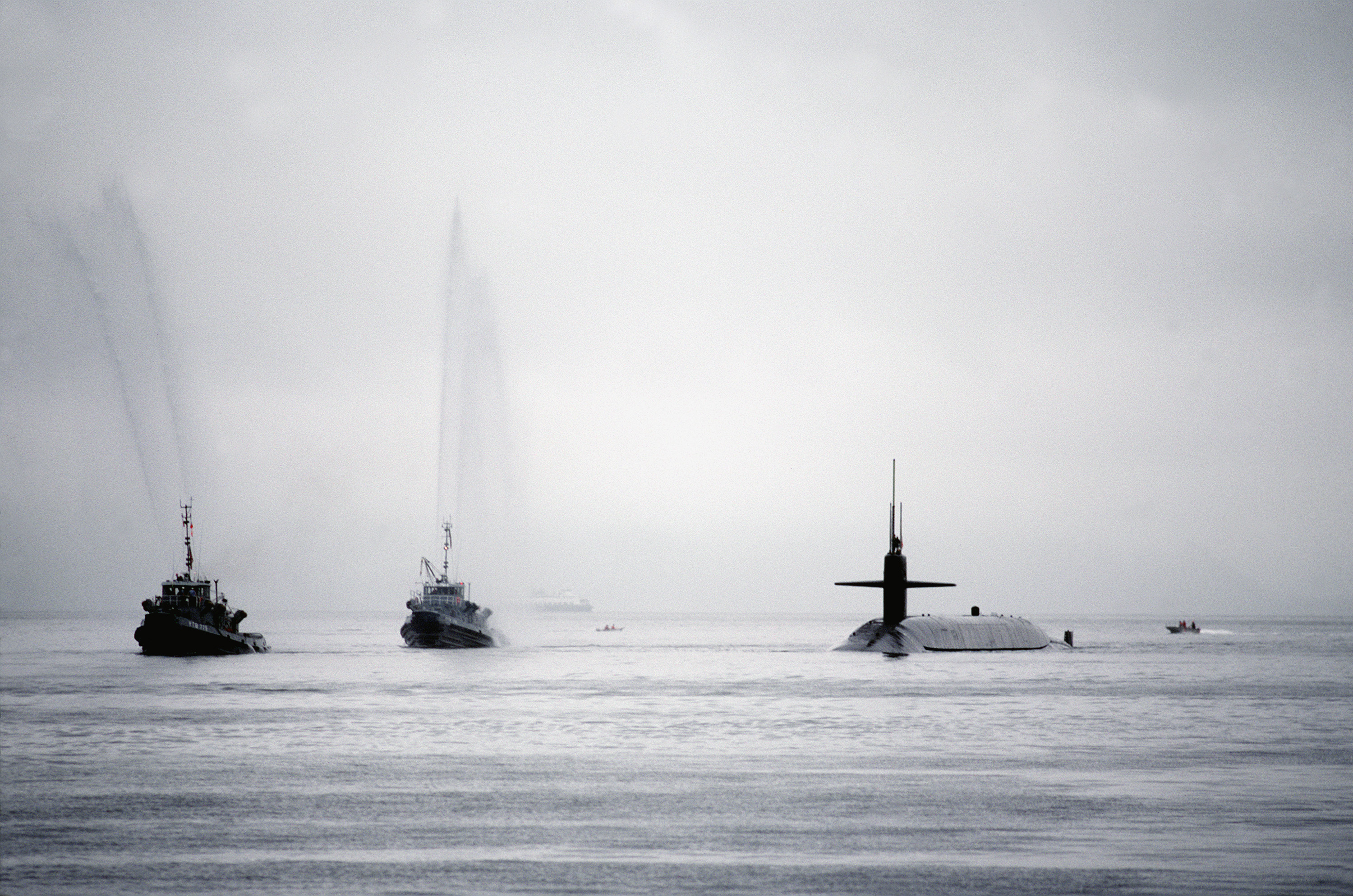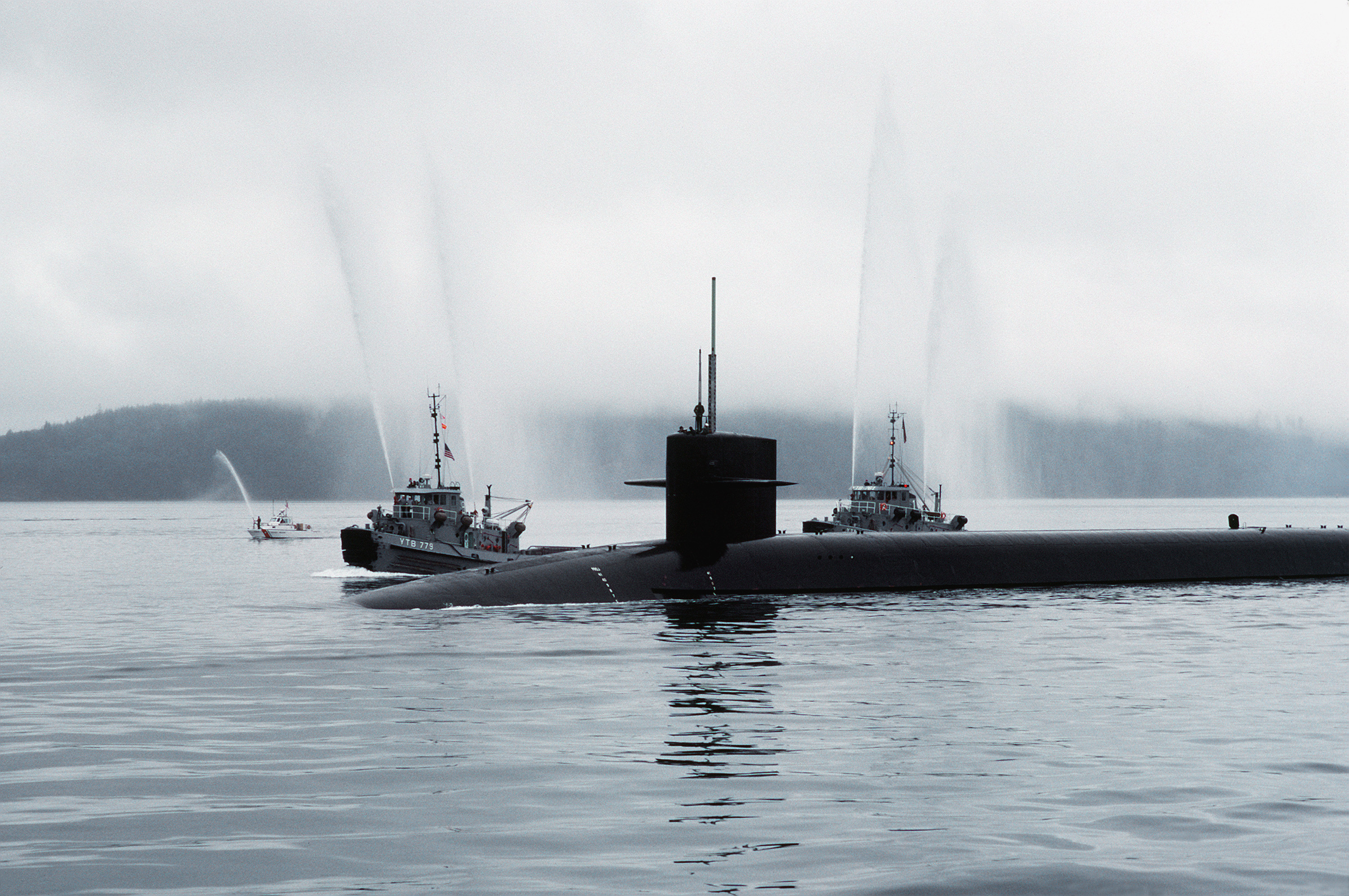 2002k | Ottumwa (YTB-761 and Manhattan (YTB-779) escort the nuclear-powered strategic missile submarine USS Ohio (SSBN-726) through the Hood Canal in Puget Sound, WA. The tugs spraying water into the air is a traditional marine welcome.