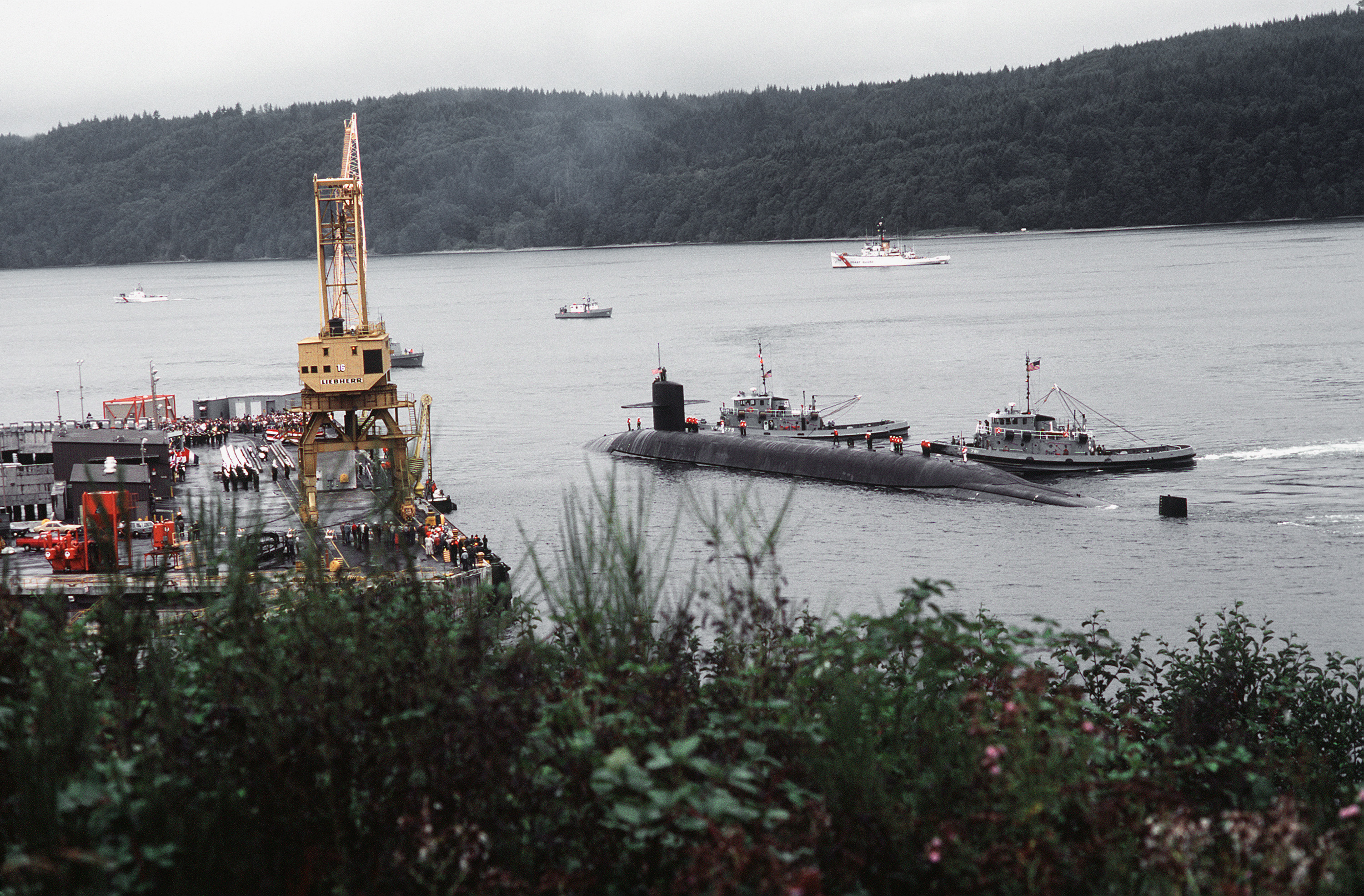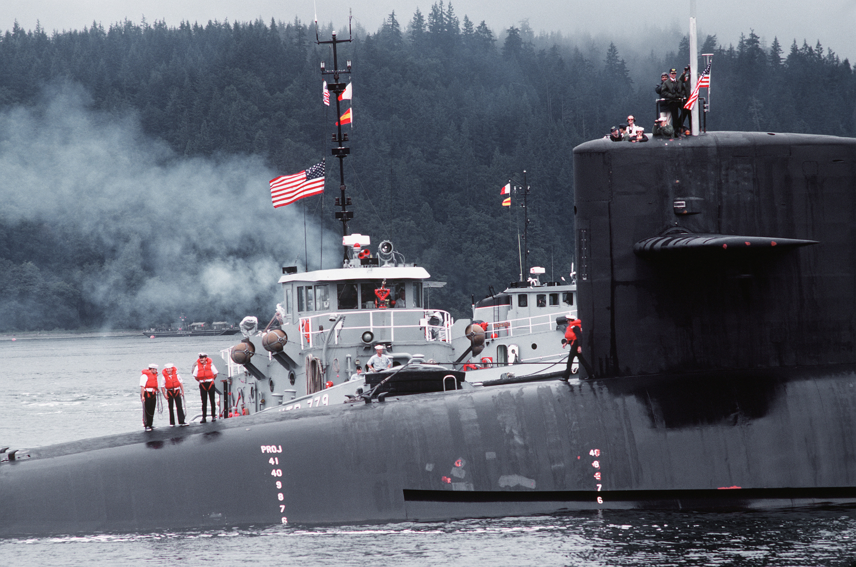1455k | Ottumwa (YTB-761) and Manhattan (YTB-779) assist in the docking of the nuclear-powered strategic missile submarine USS Ohio (SSBN-726) at Delta Pier, Naval Submarine Base Bangor, WA. Note USCGC Yocona (WMEC-168) in the background.