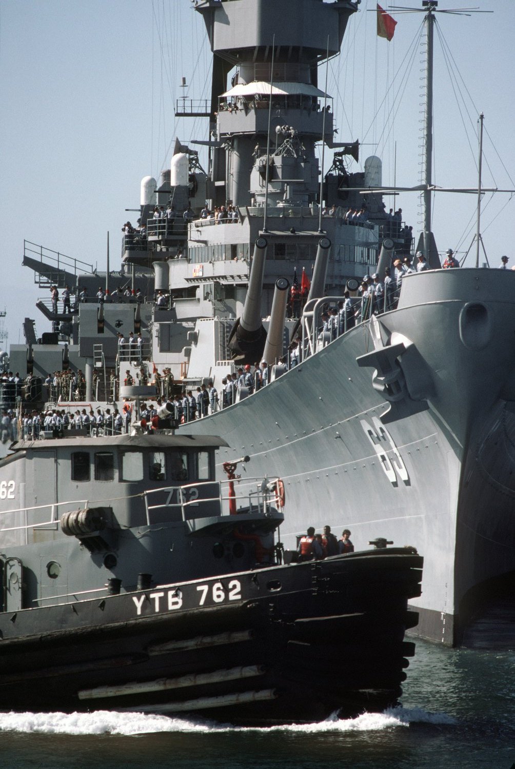 Tuscumbia (YTB-762) coming alongside the battleship USS Missouri (BB-63) as the battleship gets underway at Pearl Harbor, 8 May 1986. US Navy photo by PH2 Michael D. P. Flynn |