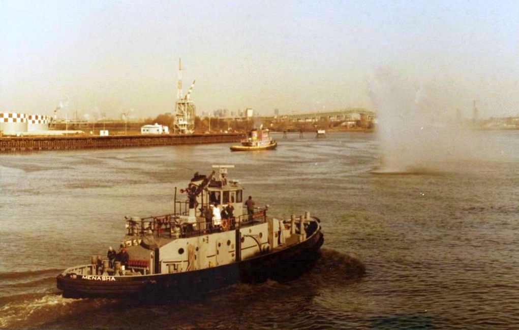 Menasha (YTM-761) underway on the Delaware River, probably in the early 1980s. |