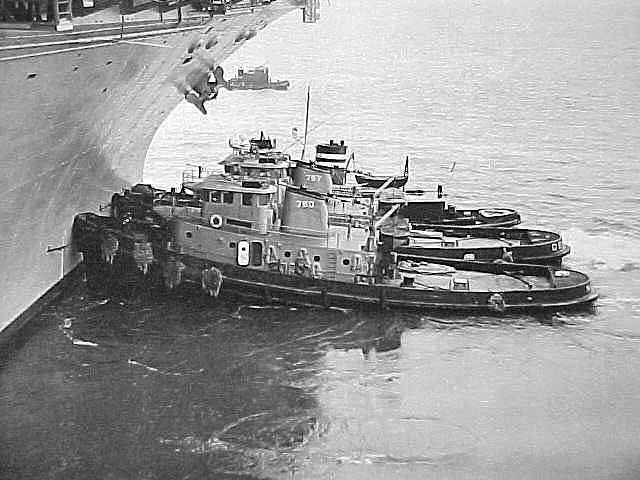 Saugus (YTB-780), Oshkosh (YTB-757) and an unidentified commercial tug ease an unidentified aircraft carrier into or out of her berth at Pier 12 Naval Station Norfolk, VA., circa 1974-1996. |