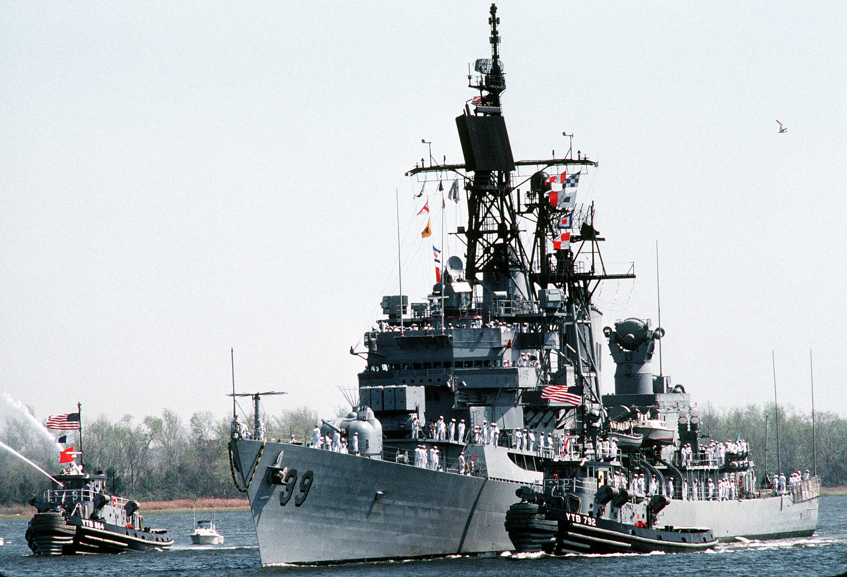 3508k | Ahoskie (YTB-804), left, sprays streams of water into the air as Antigo (YTB-792) comes alongside the guided-missile destroyer USS Macdonough (DDG-39) to escort her up the Cooper River to Naval Station, Charleston, 22 March 1991. USS Macdonough is returning to Charleston following deployment to the Persian Gulf region for Operation Desert Shield and Operation Desert Storm. DVIC photo # DN-ST-91-08395 (22 March 1991), a US Navy Photo by JO2 Oscar Sosa, now in the collections of the Defense Visual Information Center. |
