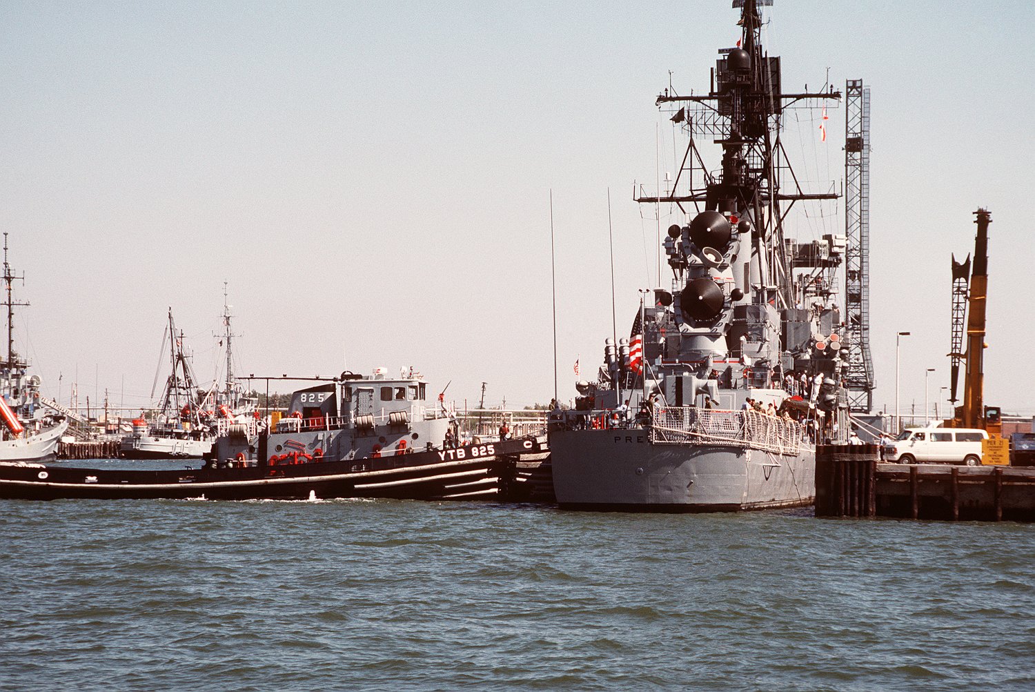 383k | Wathena (YTB-825) assists the guided missile destroyer USS Preble (DDG 46) into her berth at NOB, Norfolk, VA., 10 October 1988.