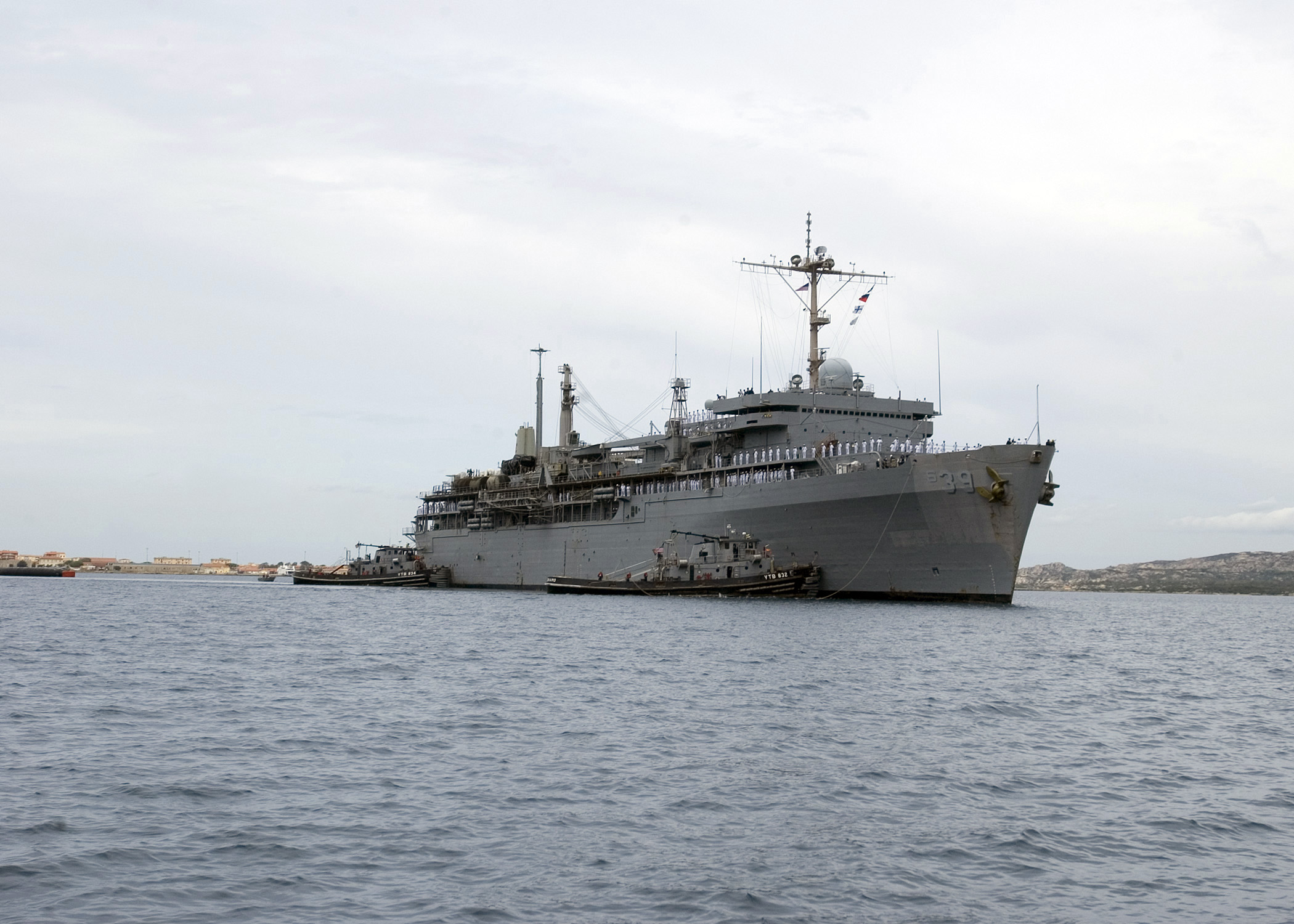 648k | Petalesharo (YTB-832) and Negwagon (YTB-834) and assist USS Emory S. Land (AS-39) as she departs her homeport in Italy for the final time on 29 September 2007. USS Emory S. Land left after eight years of providing mobile fleet support to submarines and surface ships in the 6th Fleet area of responsibility. US Navy photo # 070929-N-2566U-001 LA MADDALENA, Italy (Sept. 29, 2007) by MC2 Jesus Uranga. |