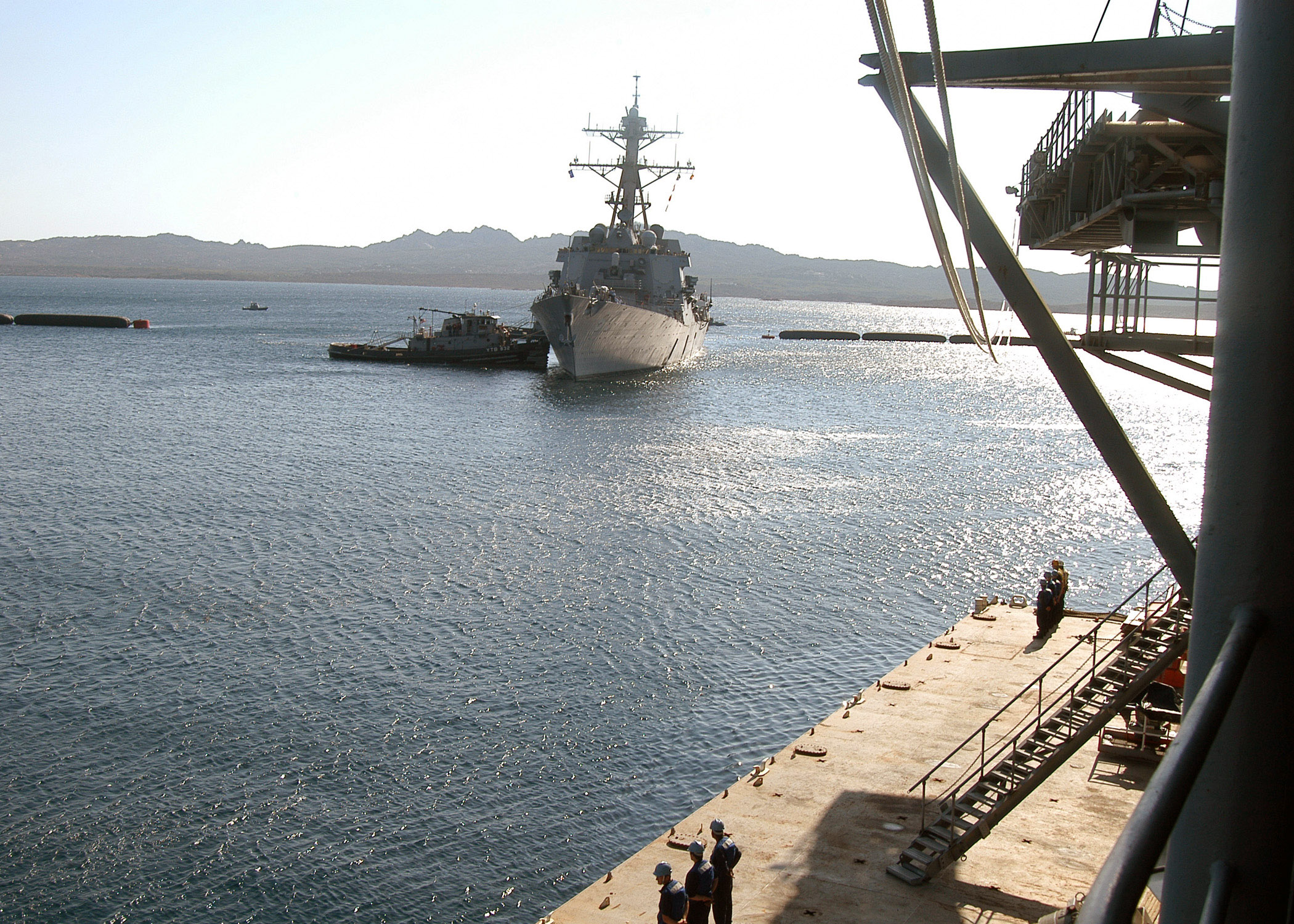648k | Petalesharo (YTB-832) assists the guided-missile destroyer USS Roosevelt (DDG-80) into her berth alongside the forward-deployed destroyer tender USS Emory S. Land (AS-39) at La Maddalena, Italy for a voyage repair availability period, 28 July 2007. US Navy photo # 070728-N-0613S-015 LA MADDALENA, Italy (July 28, 2007) by MCSN Samantha Stark. |