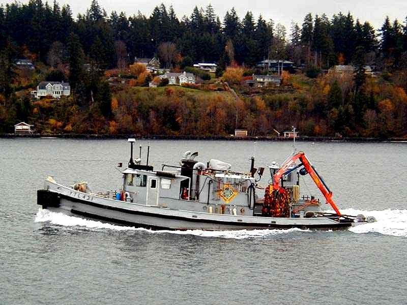 106k | YTL-432 approaching the Agate Passage, WA, probably on her way to the Naval Station at Everett, WA, while in service as a diving support boat, based at the Puget Sound Naval Shipyard, date unknown. Photo courtesy of Ray Longaker and Paul Smith US Navy Harbor Tug Boats |