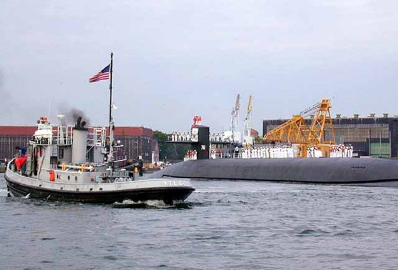 71k | YTL-602 passed the nuclear-powered ballistic missile submarine USS Maine (SSBN-741), 8 June 2000, probably at or near Portsmouth Naval Shipyard, Portsmouth, N.H. Photo courtesy of Bill Mozinga and Paul Smith |