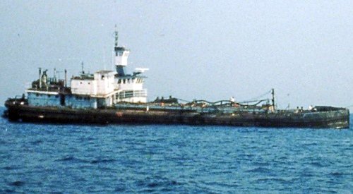 Hulk of Alan Martin under tow enroute to become part of the Shark River Artificial Reef off the coast of NJ, circa 10 September 1987. |