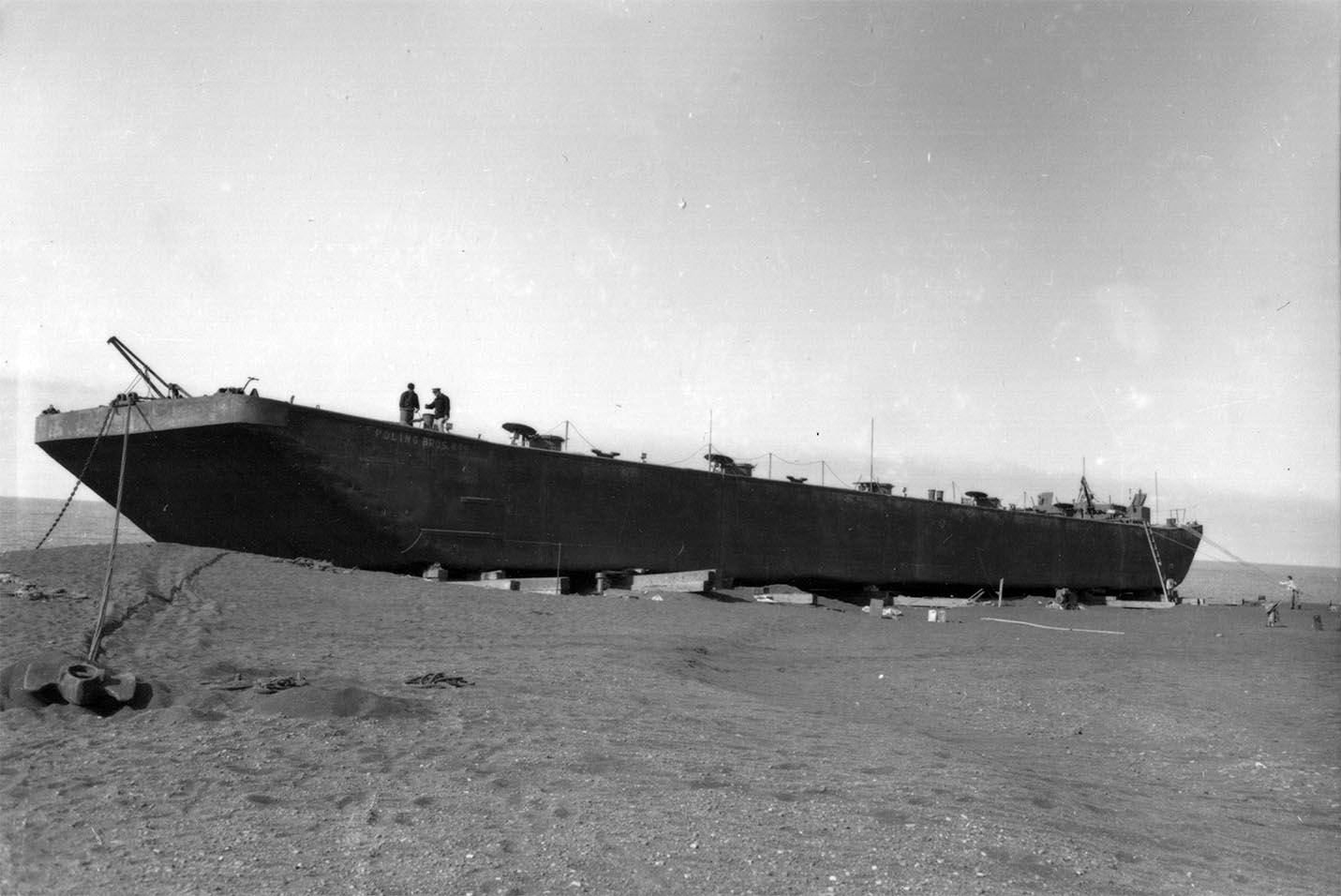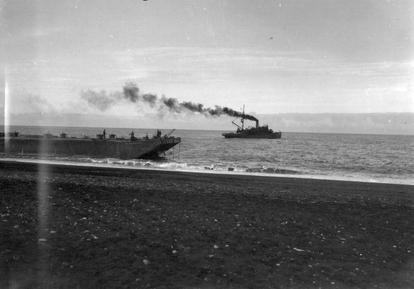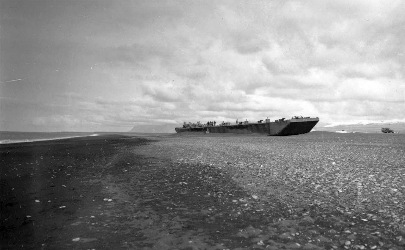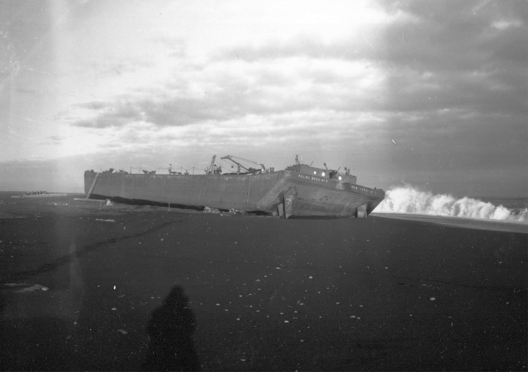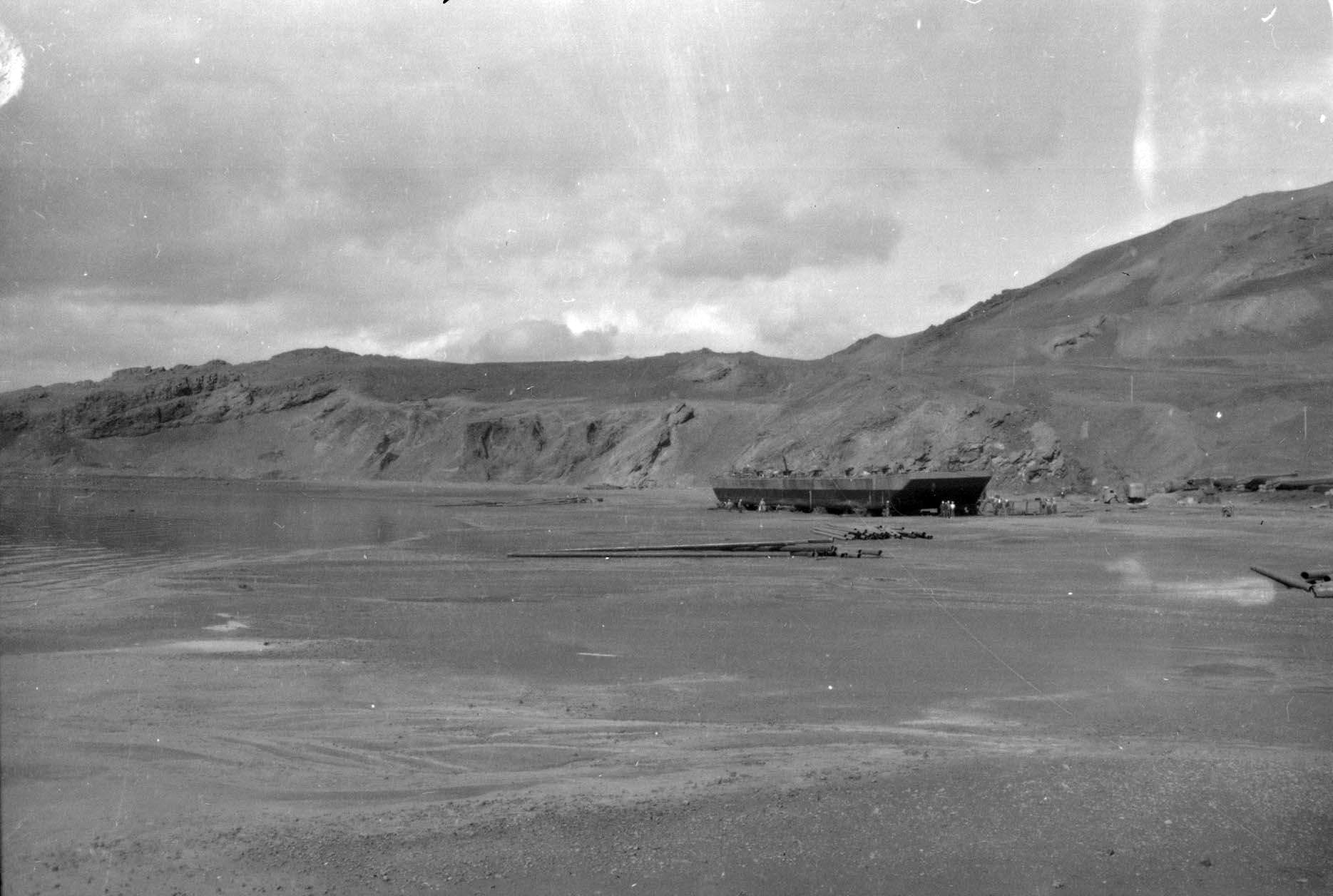 155k | Barge "Poling Brothers No. 9" aground on a black sand beach eight miles from the village of Vik on the southern shore of Iceland. Precise date is unknown, but was shot during salvage of the barge in late May / early June of 1942. This view is of the port